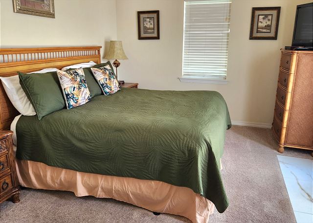 FIRST FLOOR: Primary bedroom with king bed, bathroom with garden tub & standalone shower, kitchen, living area, and balcony access