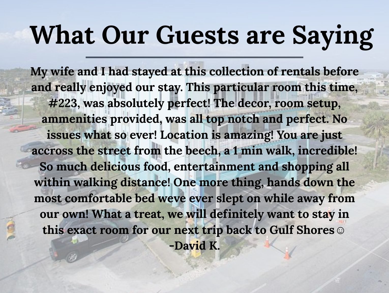 "My wife and I had stayed at this collection of rentals before and really enjoyed our stay. This particular room this time, #223, was absolutely perfect! The decor, room setup, ammenities provided, was all top notch and perfect. No issues what so ever! Location is amazing! You are just accross the street from the beech, a 1 min walk, incredible! So much delicious food, entertainment and shopping all within walking distance! One more thing, hands down the most comfortable bed weve ever slept on while away from our own! What a treat, we will definitely want to stay in this exact room for our next trip back to Gulf Shores☺️"