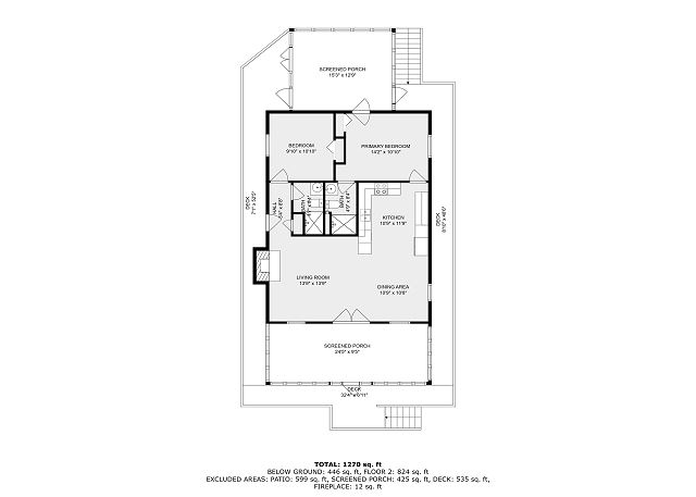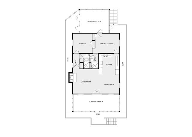 UPPER LEVEL: Two bedrooms with queen beds (one with ensuite bathroom and porch access), plus full bathroom on main floor