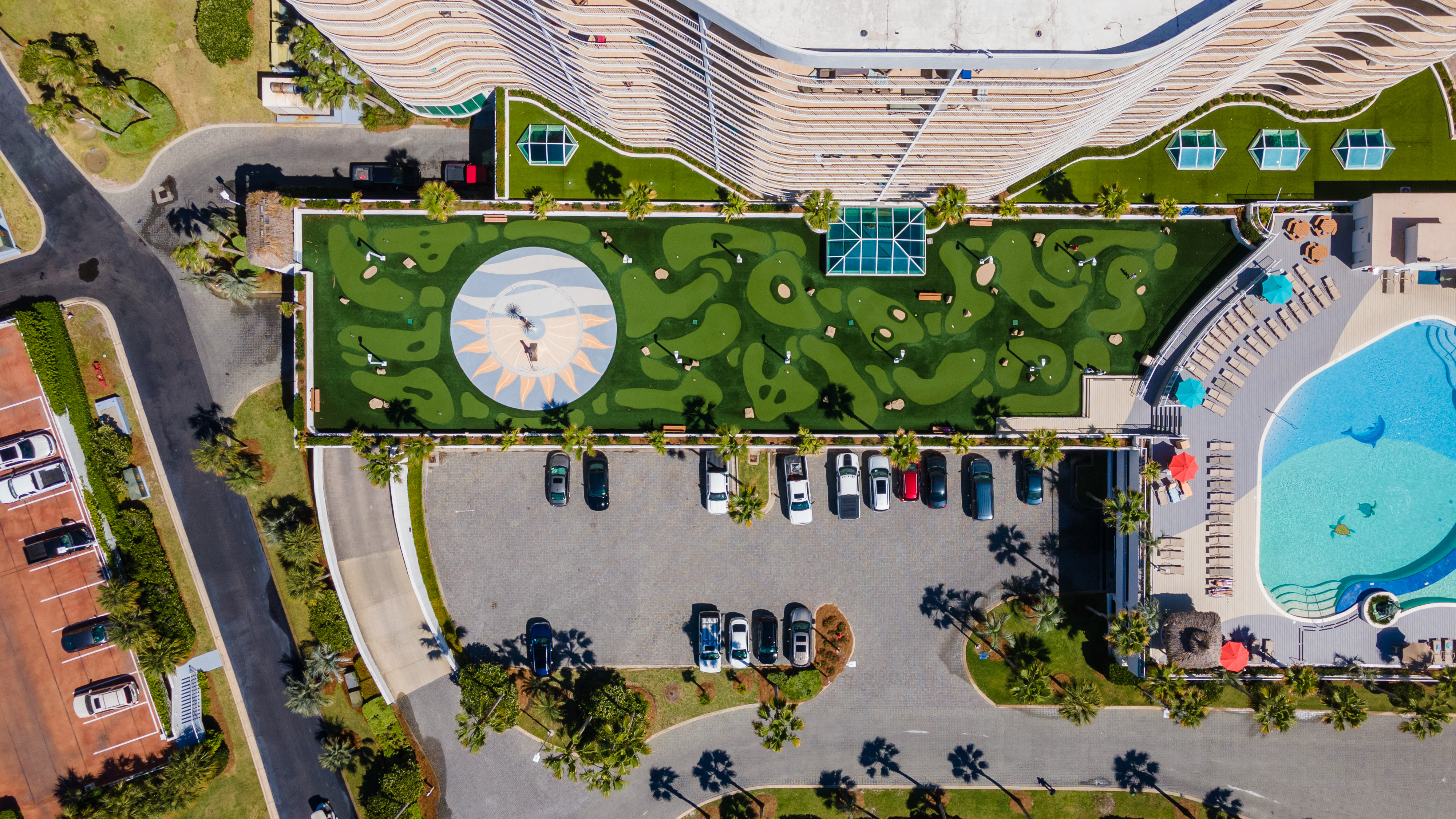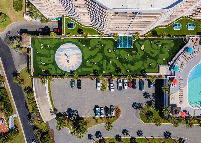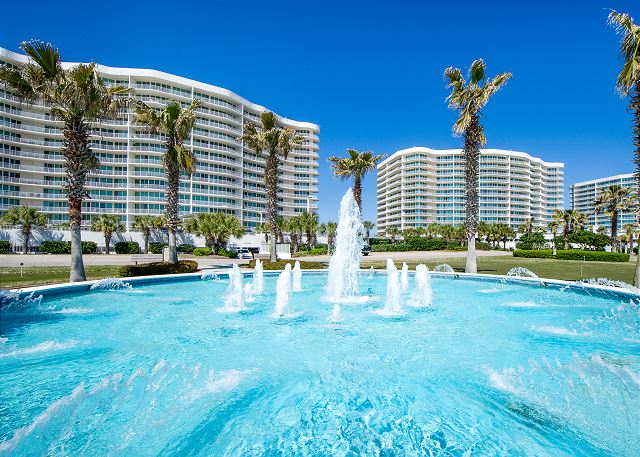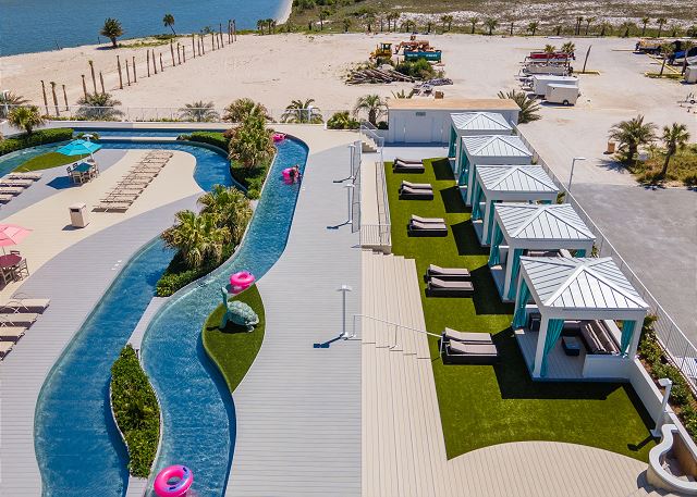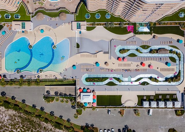 - Resort-style amenities including pools, lazy river, hot tubs, fitness center, and beach shuttle