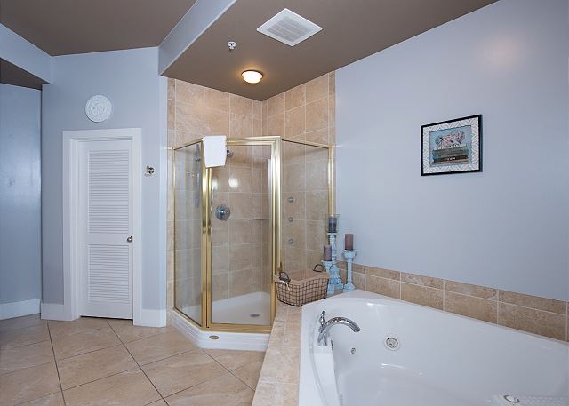- Primary bedroom with king bed, ensuite Jacuzzi tub, walk-in shower, and balcony access