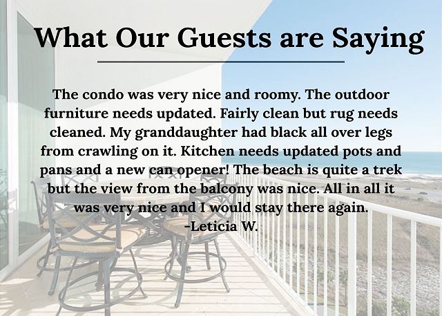 "Overall very great stay unit was well stocked and beds very comfortable! Some furniture in need of attention and area rug needs replacing soon but that’s all very minor and didn’t affect the stay at all. Great view off the balcony, and very quiet for such a large building! Pools are very nice only complaint was lazy River was still not usable because of upkeep! Overall we loved our stay and can’t wait to return for another vacation!"