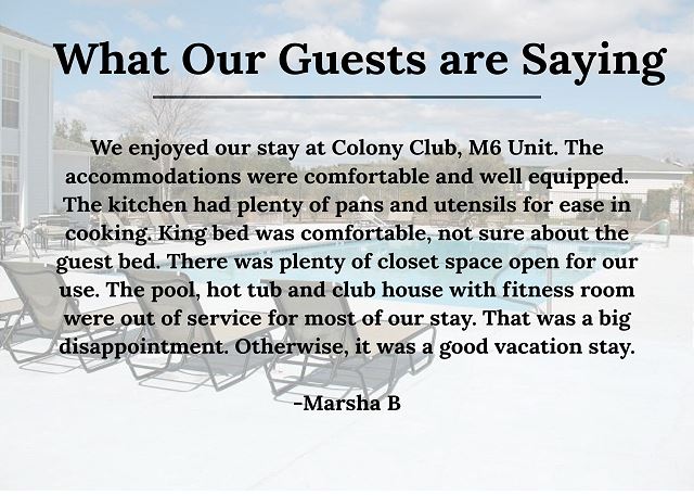 "We enjoyed our stay at Colony Club, M6 Unit. The accommodations were comfortable and well equipped. The kitchen had plenty of pans and utensils for ease in cooking. King bed was comfortable, not sure about the guest bed. There was plenty of closet space open for our use. The pool, hot tub and club house with fitness room were out of service for most of our stay. That was a big disappointment. Otherwise, it was a good vacation stay."
