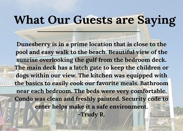 "Thank you for taking time to write a review of your stay in Deans Dunes. It is a beautiful property with all the amenities needed to make your vacation perfect and the views from the back porches are breathtaking. The short walk to the beautiful white, sandy beach makes it easy to come and go as you like without ever getting in the car to drive or leaving the neighborhood. We hope you will call us soon to book your next fall is a perfect time for visiting the beach too! Sincerely, Sunset Properties Staff"
