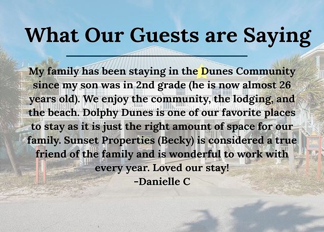 "My family has been staying in the Dunes Community since my son was in 2nd grade (he is now almost 26 years old). We enjoy the community, the lodging, and the beach. Dolphy Dunes is one of our favorite places to stay as it is just the right amount of space for our family. Sunset Properties (Becky) is considered a true friend of the family and is wonderful to work with every year. Loved our stay!"