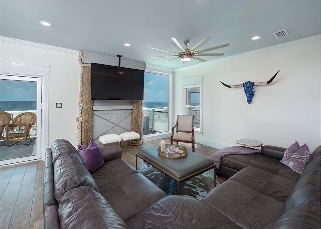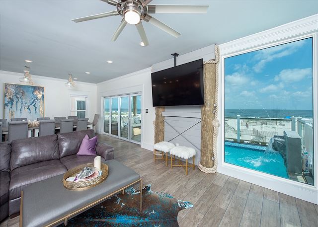 MAIN LIVING AREA: Open-concept living with plush seating, large flat-screen TV, and panoramic Gulf views