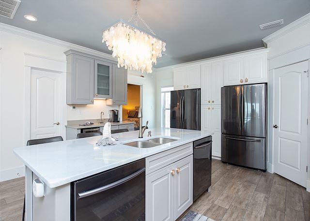 KITCHEN/DINING: Fully equipped kitchen with two refrigerators, two dishwashers, generous counter space, and dining for 14 with bar seating