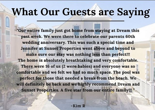 "Our entire family just got home from staying at Dream this past week. We were there to celebrate our parents 60th wedding anniversary. This was such a special time and Jennifer at Sunset Properties went above and beyond to make sure our stay was nothing less than perfect!!! The home is absolutely breathtaking and very comfortable. There were 16 of us ( 2 were babies) and everyone was so comfortable and we felt we had so much space. The pool was perfect for those that needed a break from the beach. We will definitely be back and we highly recommend Dream and Sunset Properties. A five star from our entire family!!! "