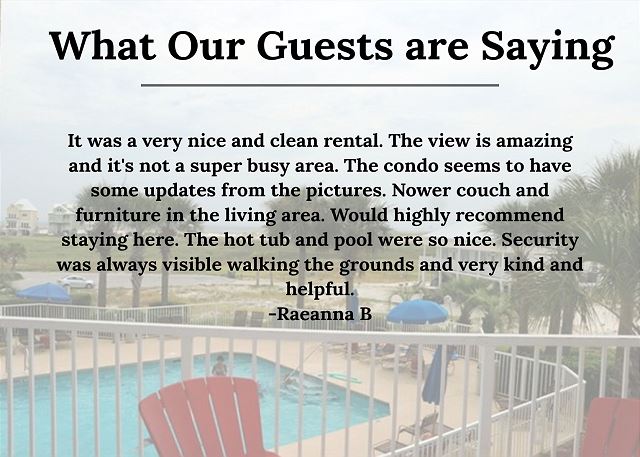 "It was a very nice and clean rental. The view is amazing and it's not a super busy area. The condo seems to have some updates from the pictures. Nower couch and furniture in the living area. Would highly recommend staying here. The hot tub and pool were so nice. Security was always visible walking the grounds and very kind and helpful. "