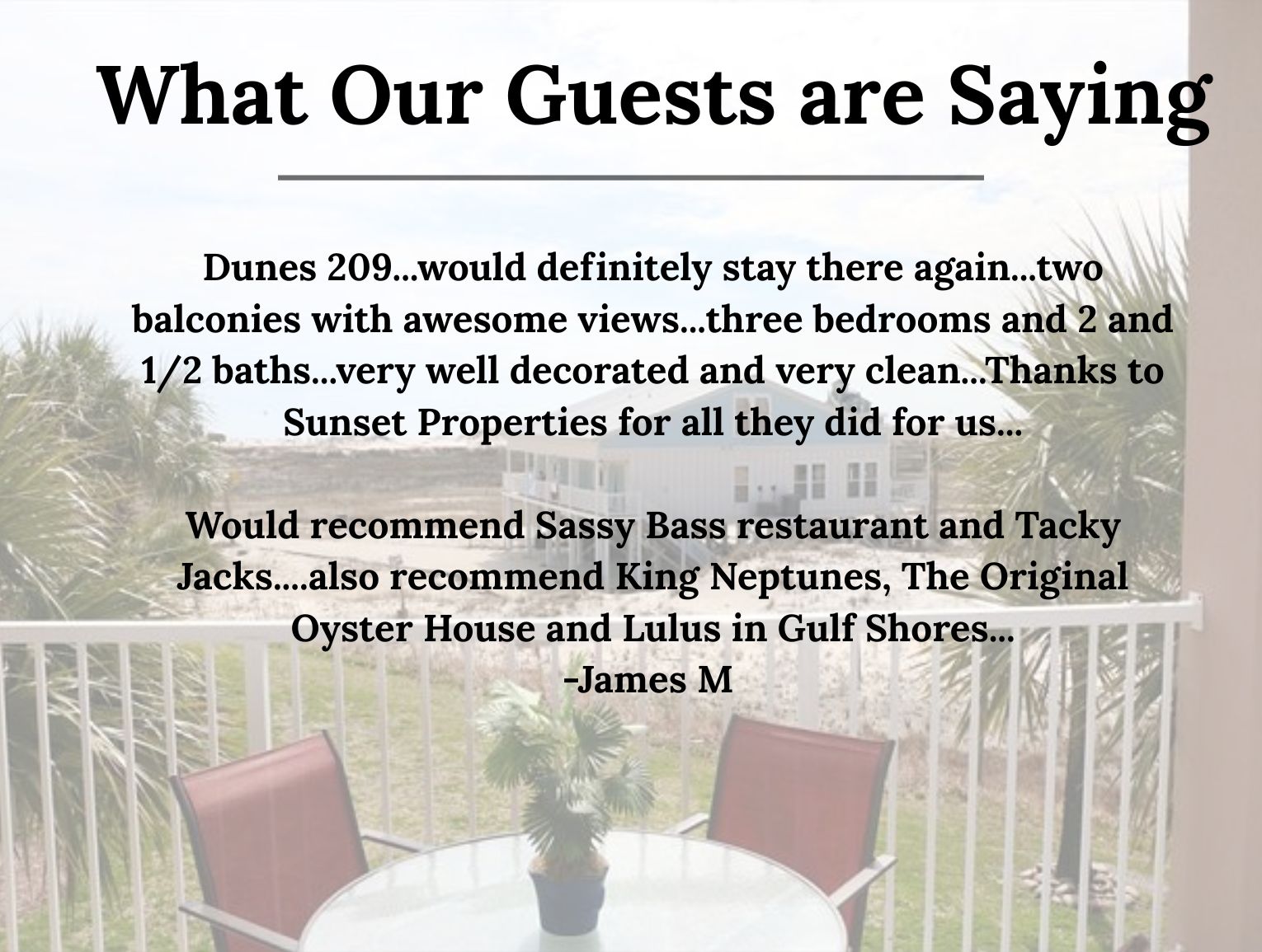 "This was our first time renting a condo for our vacation. Also our first time in Alabama. People are very friendly their.We were very pleased that everything went smoothly . Condo was very clean and spacious. We had a great time , and would definitely like to go back in the future. Thank you Sunset Properties for an enjoyable stay."