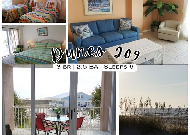 "Dunes 209...would definitely stay there again...two balconies with awesome views...three bedrooms and 2 and 1/2 baths...very well decorated and very clean...Thanks to Karen Davis and Sunset Properties for all they did for us...