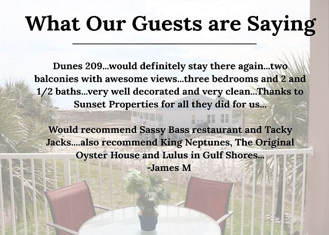 "Thank you for taking time to review your stay with us in Dunes condo 209. A great end unit with great views! A perfect place for a relaxing beach visit. We look forward to booking your next stay with us soon! Sunset Properties Staff"