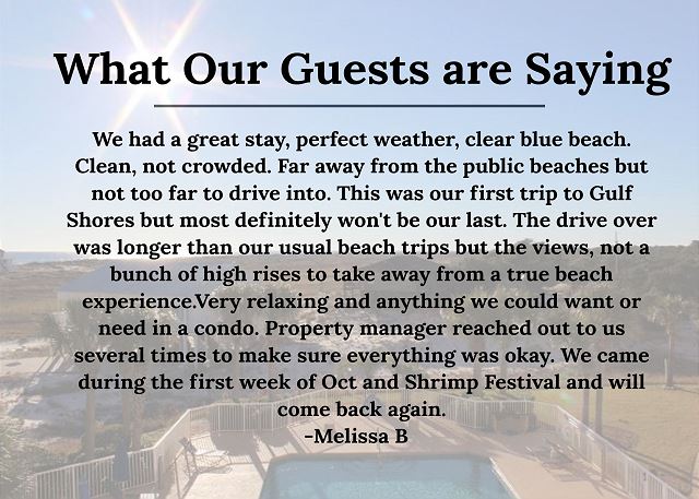 "We had a great stay,perfect weather, clear blue beach. Clean, not crowded. Far away from the public beaches but not too far to drive into. This was our first trip to Gulf Shores but most definitely won't be our last. The drive over was longer than our usual beach trips but the views, not a bunch of high rises to take away from a true beach experience.Very relaxing and anything we could want or need in a condo. Property manager reached out to us several times to make sure everything was okay. We came during the first week of Oct and Shrimp Feastival and will come back again. "