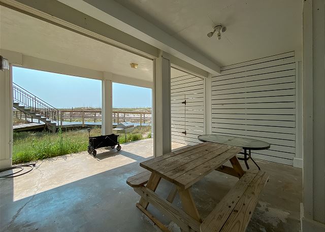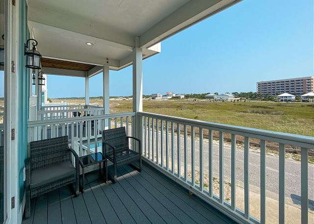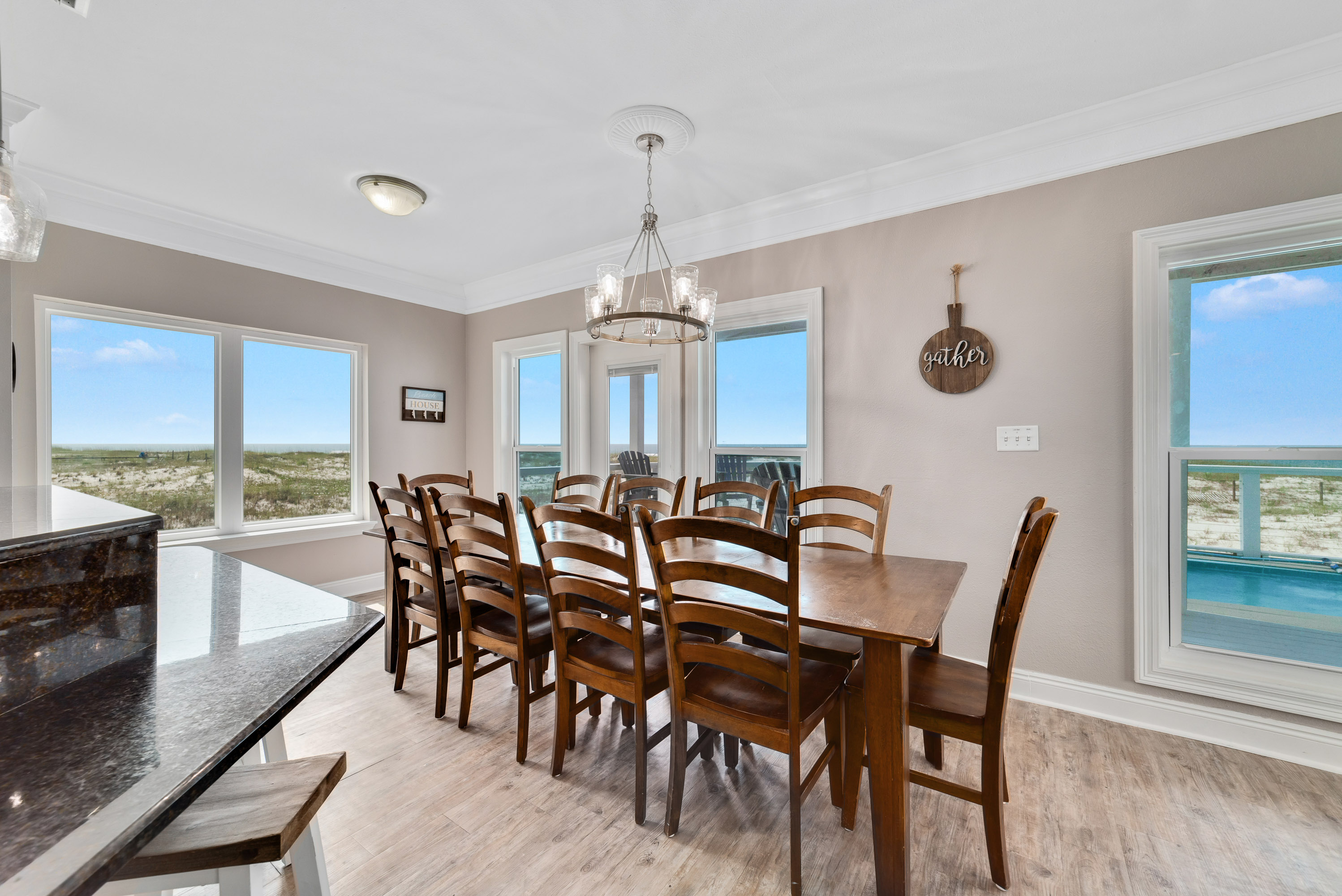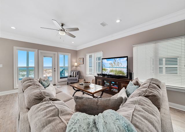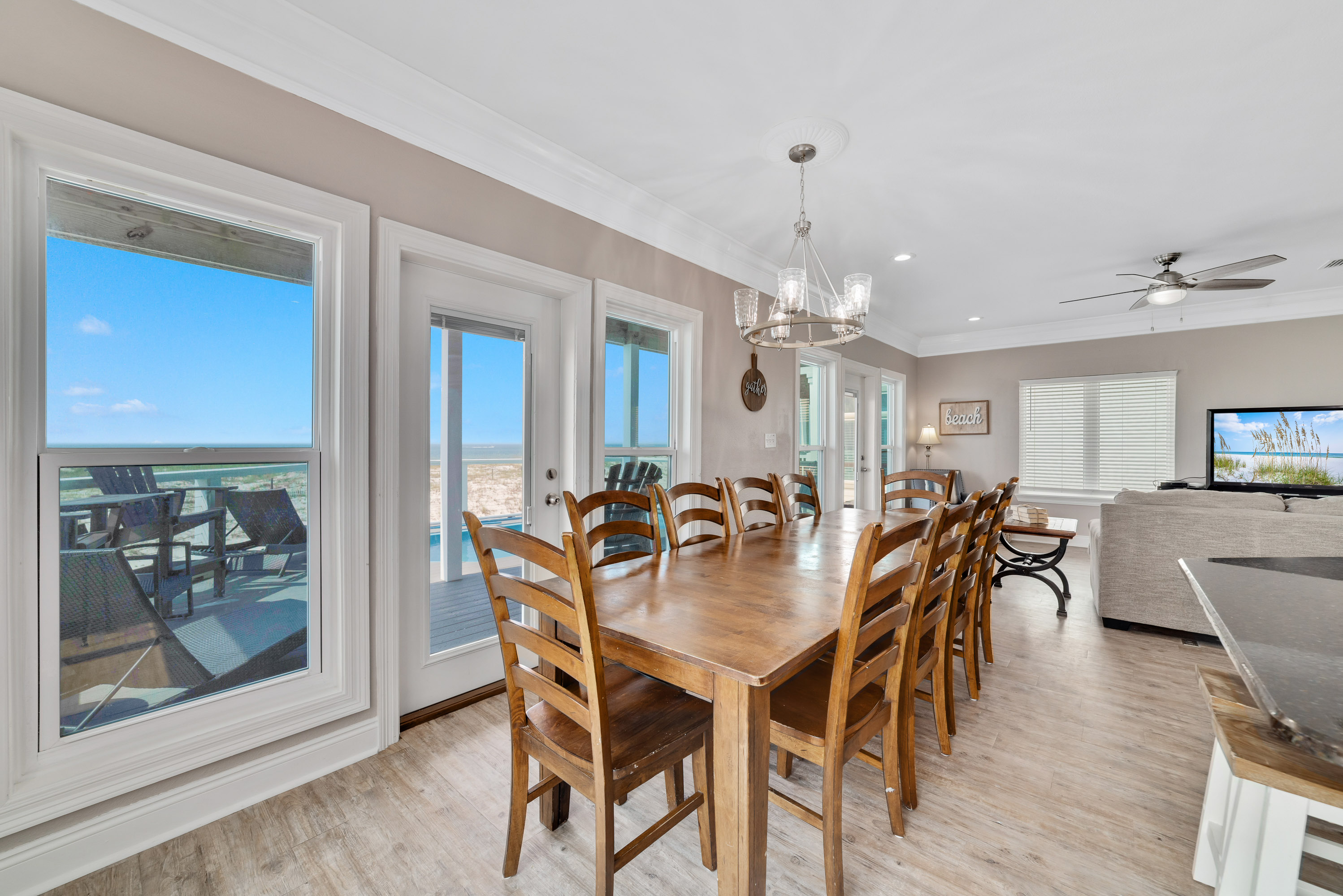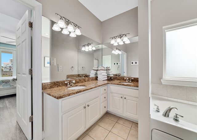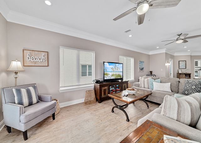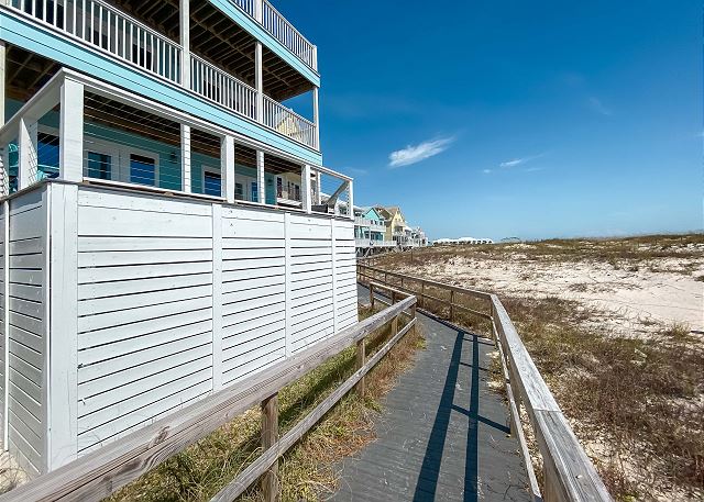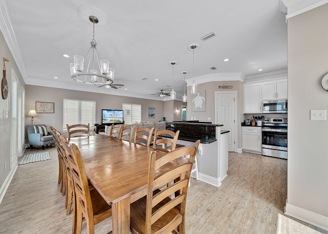 "Girls trip! 10 of us enjoyed this beautiful property to the max. The open, well stocked kitchen provided the space needed for multiple cooks at the same time. We all fit around the oversized dining room table without having to use the barstools nor the extra table in the living room - we put a puzzle on that table. ;). There is even a grocery delivery service if needed for an additional fee. We spread out all over the house and still had an unused room. Although we didn’t watch much tv, every room had one if needed. The sunset view from the top balcony was beautiful. We all gathered each morning with our coffee at the Adirondack chairs on the kitchen level balcony. The host provided a wagon, chairs, and beach toys in a ground level closet - super convenient since we flew in and couldn’t bring those supplies. It’s a short walk on a wooden boardwalk to the beach. The community is gated and we felt safe at all times. I would highly recommend this beach house to others who are searching and we hope to return sooner rather than later. "