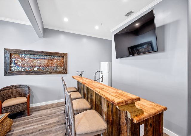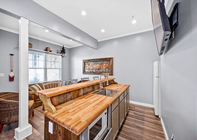 While this condo does not include a full kitchen or in-unit washer/dryer, it features a full-size refrigerator, microwave, and smart TVs in both the living room and bedroom. Complimentary coffee is available 6 am–12 pm daily at the Dock Store next door, and Tacky Jacks 2 restaurant is steps away for breakfast, lunch, or dinner. Guests can also rent boat slips at the marina for $2 per foot, which includes trailer parking, making it ideal for boating enthusiasts.
