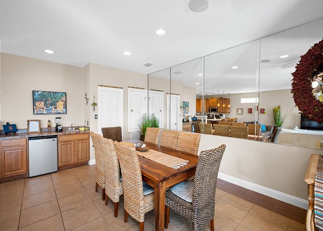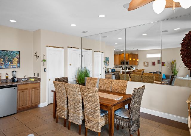 FIRST FLOOR: Guest bedroom with queen bed and shared bath, open living/dining area with fully equipped kitchen, seating for 8 at dining table, 3 at bar, 62" smart TV, wet bar, wine cooler