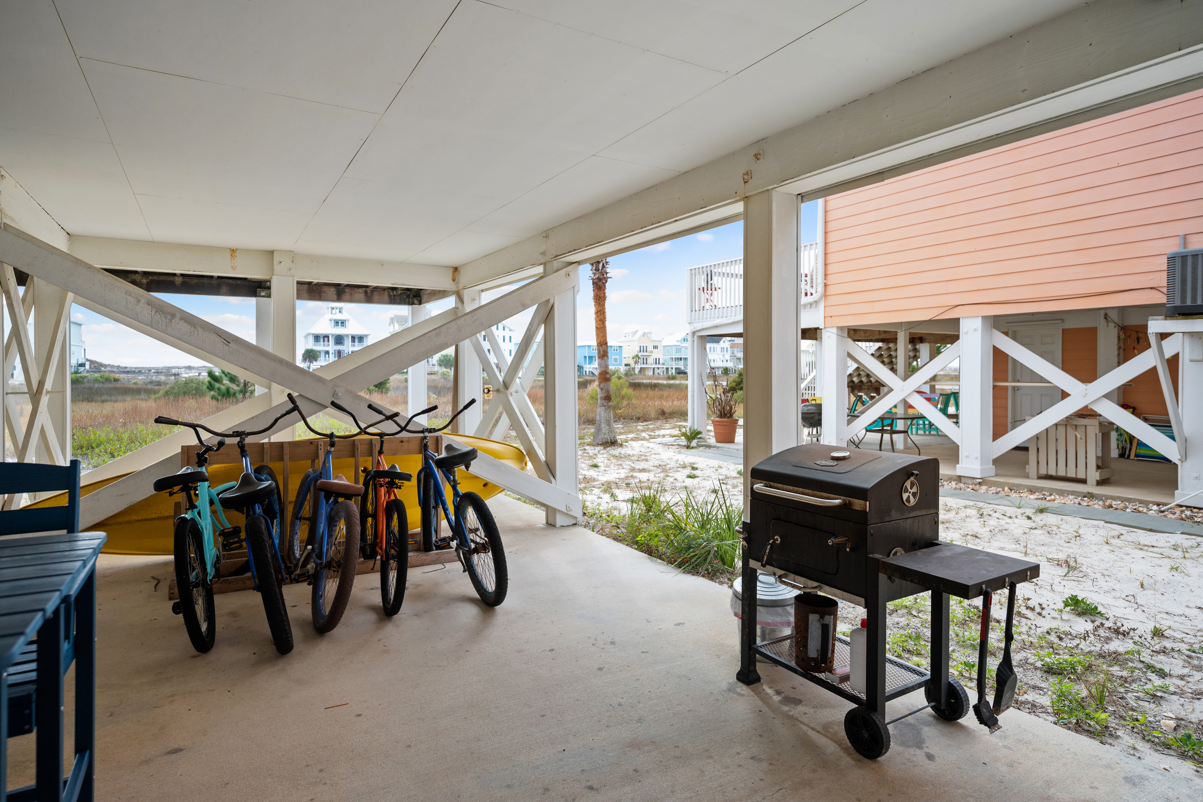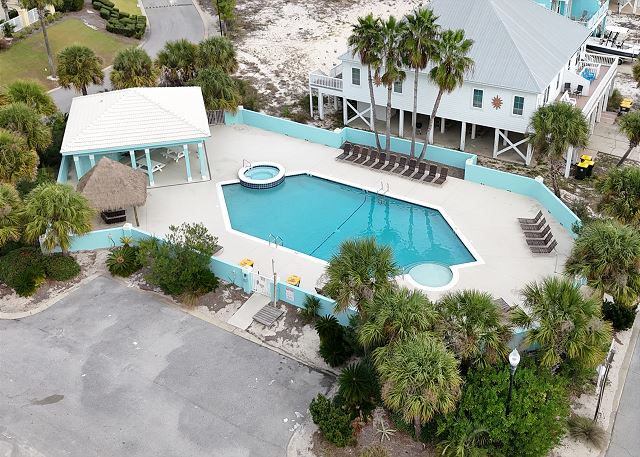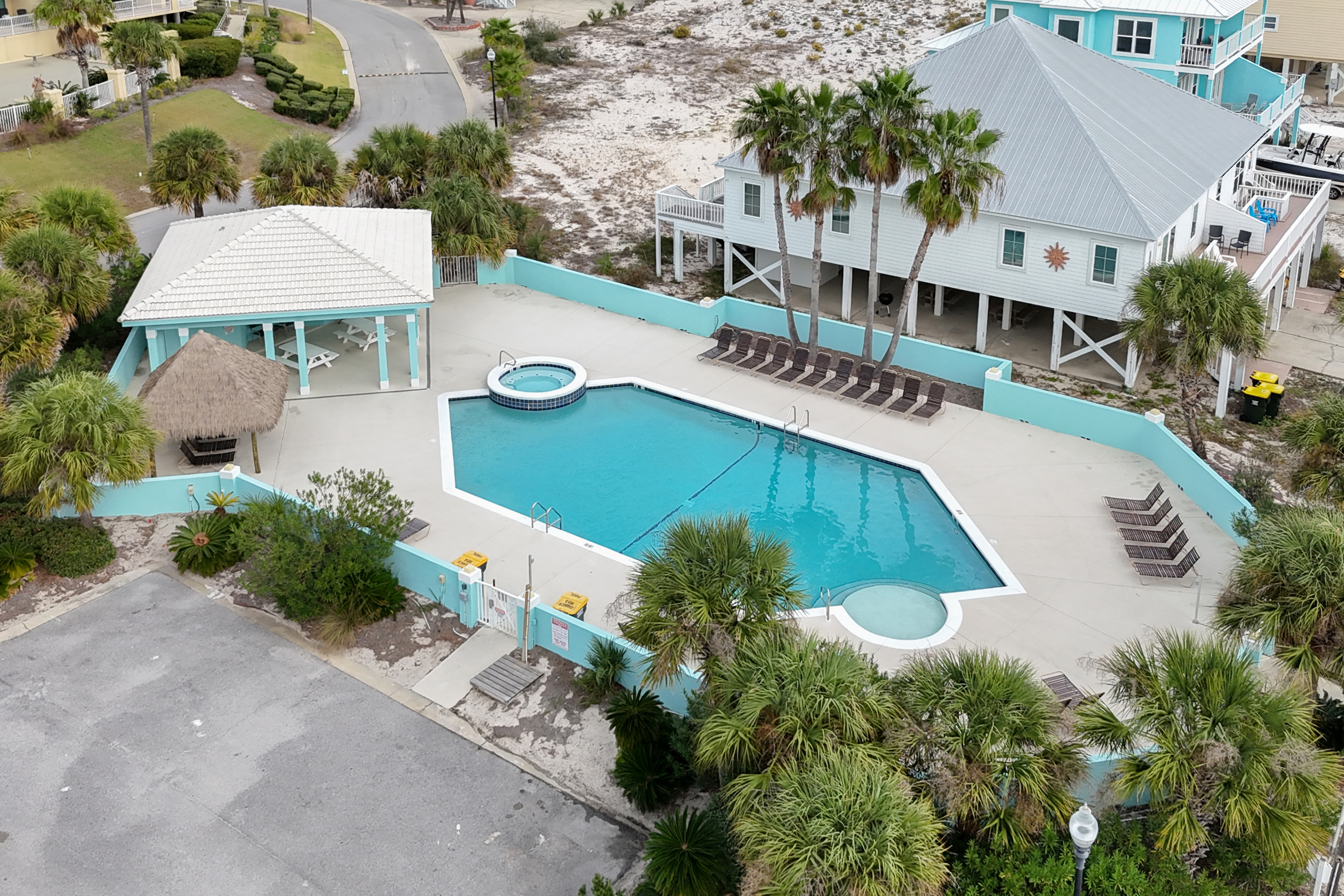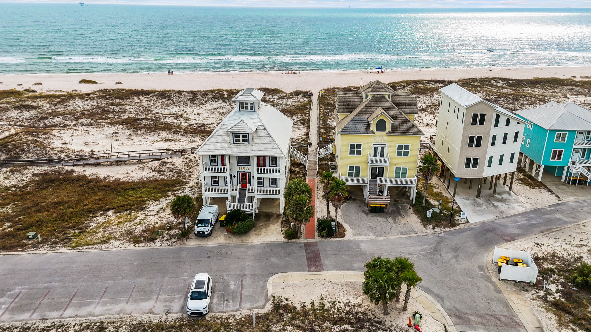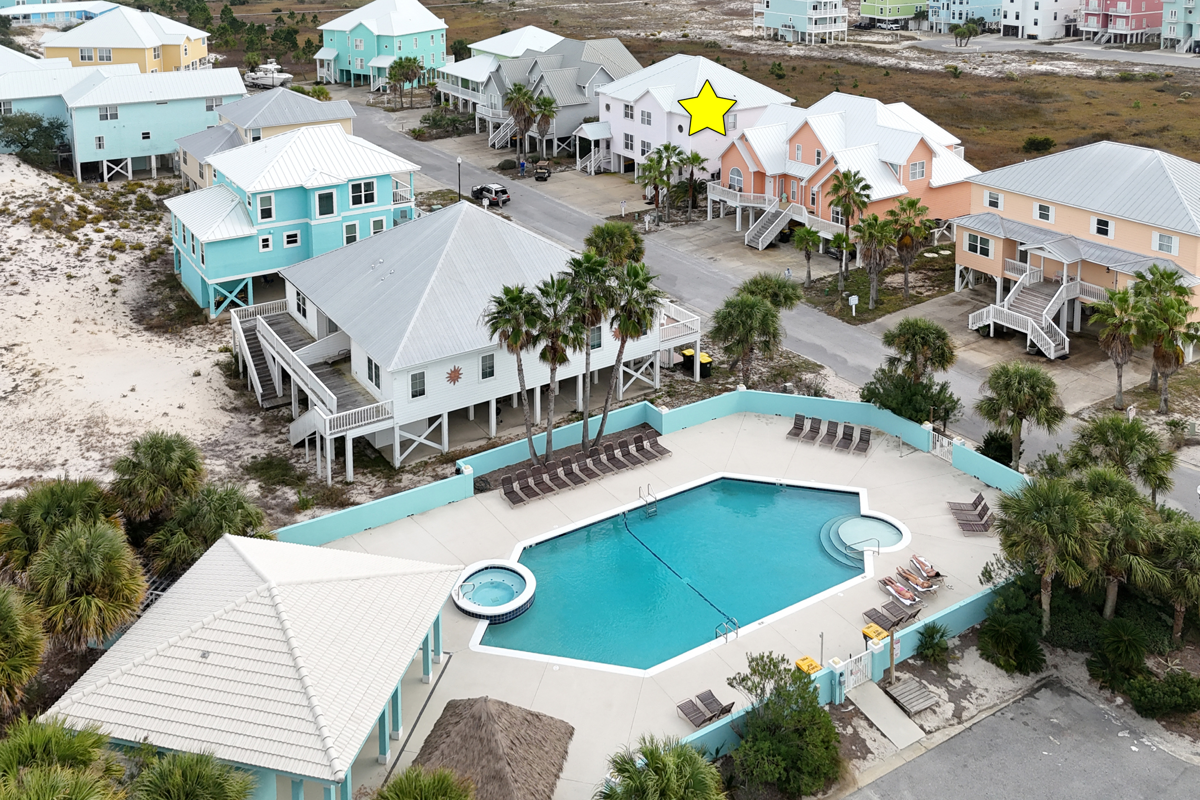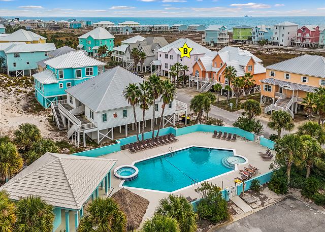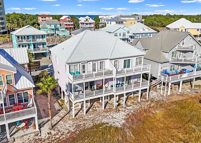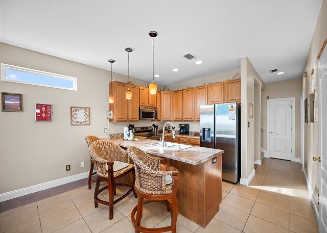 Enjoy Gulf views from the upstairs balcony, relax in the living/family room with 62" smart TV, or prepare meals in the fully equipped kitchen. The home features a wet bar, wine cooler, and comfortable dining spaces. The community pool is just two houses away, and the pristine white-sand beach is only 100 yards from the home. Covered parking is provided for convenience.