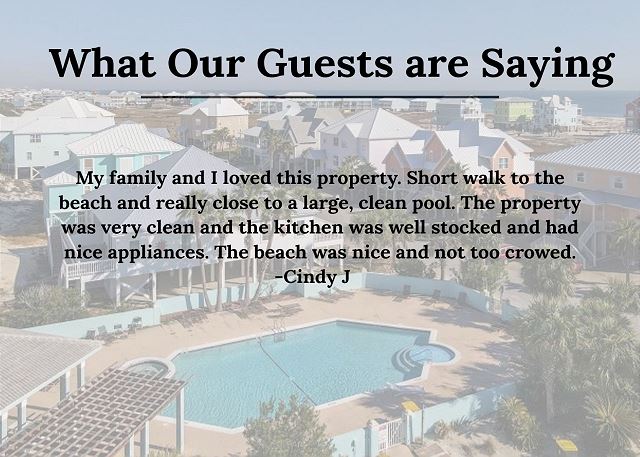 "My family and I loved this property. Short walk to the beach and really close to a large, clean pool. The property was very clean and the kitchen was well stocked and had nice appliances. The beach was nice and not too crowed. "