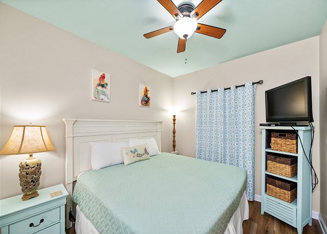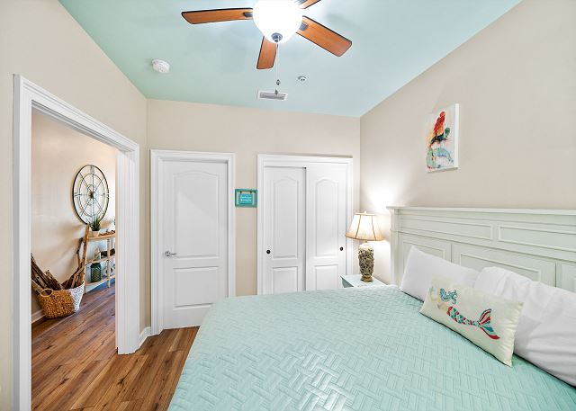 PRIMARY BEDROOM: King bed with access to shared full bath