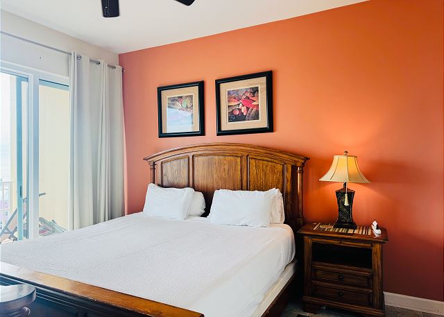 PRIMARY BEDROOM: King bed with private bath and balcony access