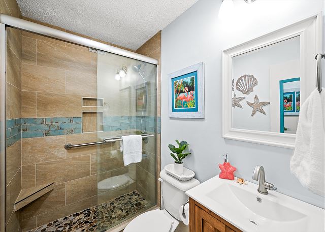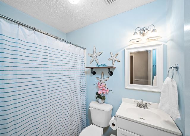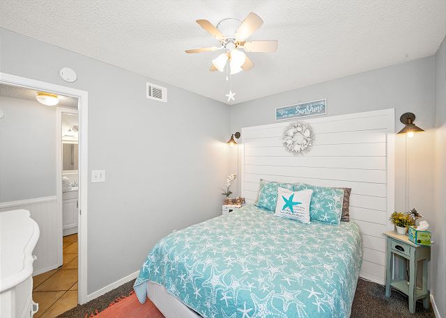 SECOND BEDROOM: Queen bed with shared bath access
