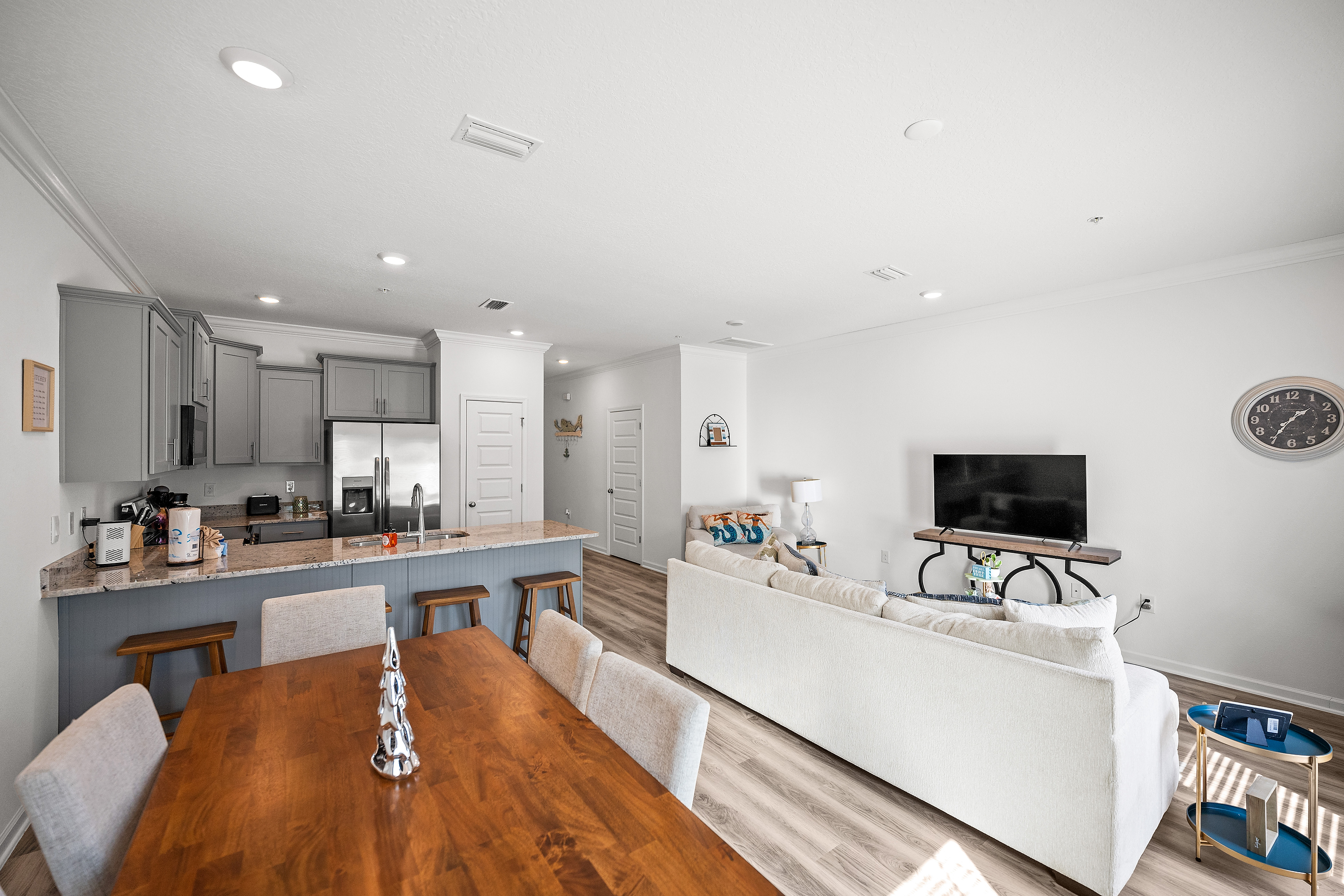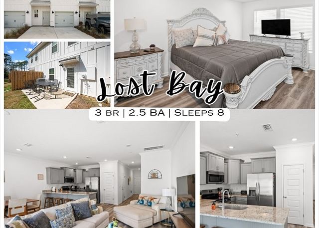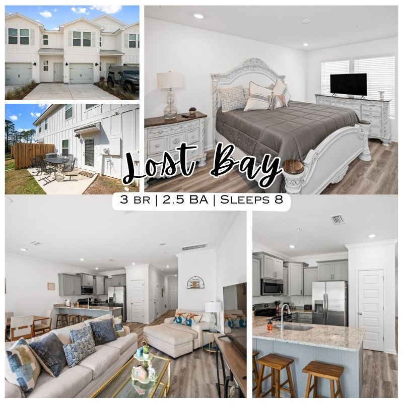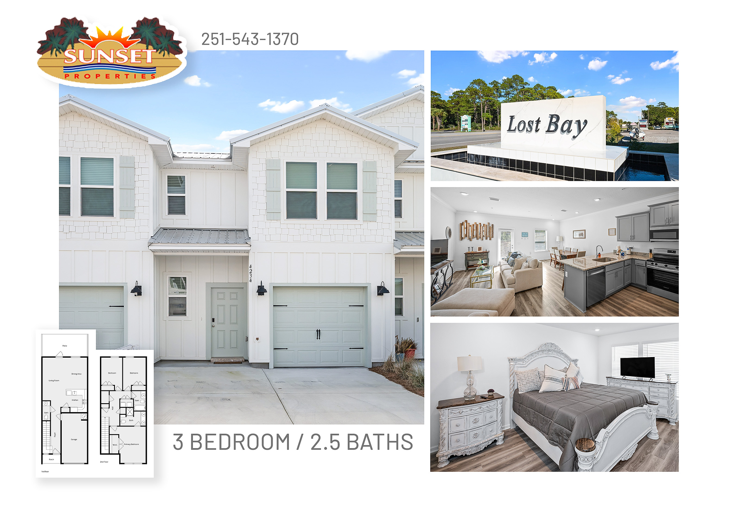 Welcome to LOST BAY, a beautifully designed 3-bedroom, 2.5-bath townhome in Orange Beach, Alabama. With 1,437 square feet of modern living space, this two-story home offers an open layout filled with natural light and stylish finishes. The kitchen seamlessly connects to the dining and living areas, creating the perfect space for entertaining or unwinding, while the private back patio extends your living space outdoors. Upstairs, the spacious primary suite features a walk-in closet and a luxurious ensuite bath with double vanity, soaking tub, and walk-in shower. Two additional bedrooms, a full bathroom, and an upstairs laundry room provide added convenience. Enjoy peace and quiet while being just minutes from the white sand beaches, abundant shopping and dining, and quick access to the Beach Express.