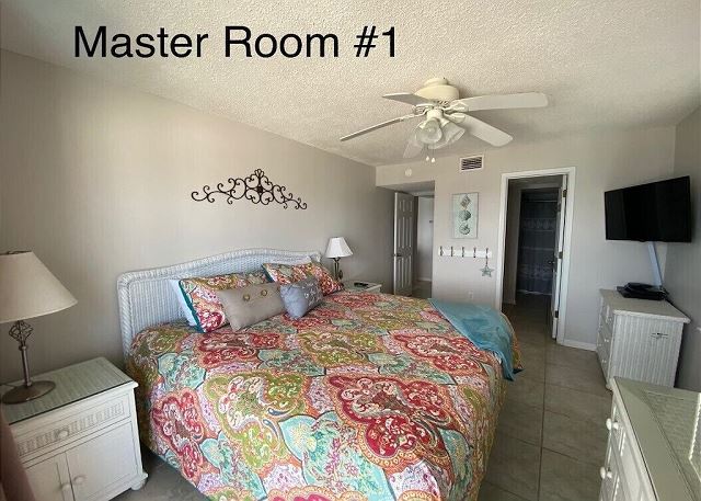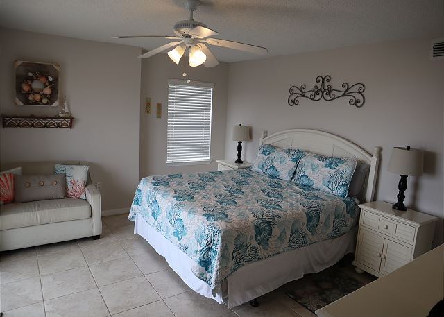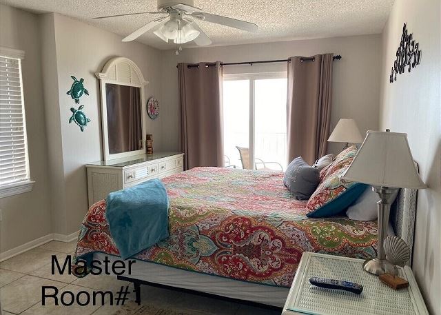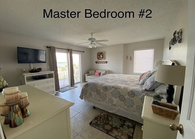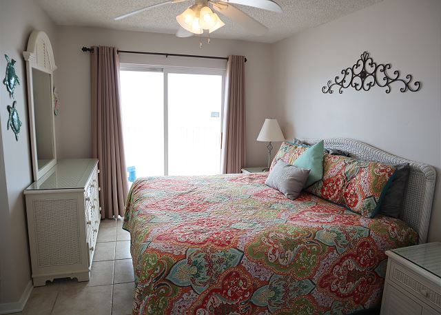 PRIMARY BEDROOM: Front master with king bed and private bath, Gulf-front view