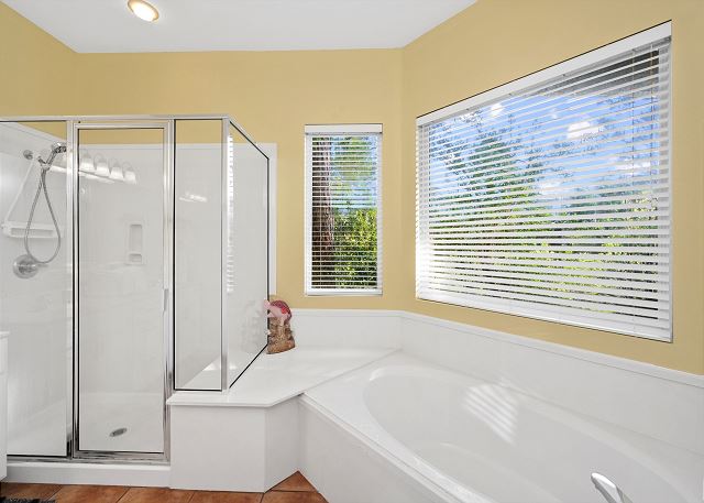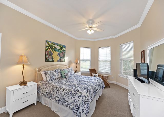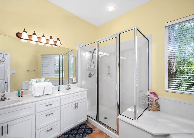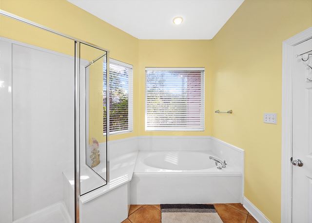 - Primary suite with king bed, walk-in closet, garden tub, separate shower, and double vanity
