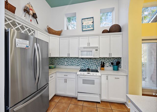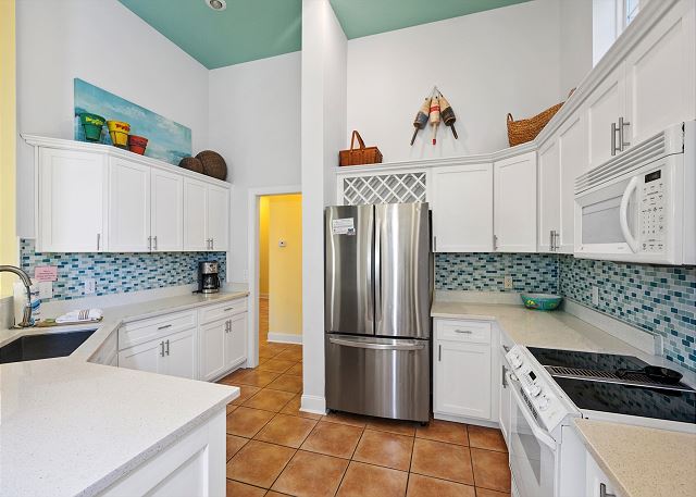 KITCHEN: Fully appointed kitchen with breakfast counter, refrigerator with icemaker, microwave, dishwasher, and laundry area with full-size washer and dryer