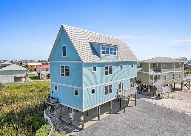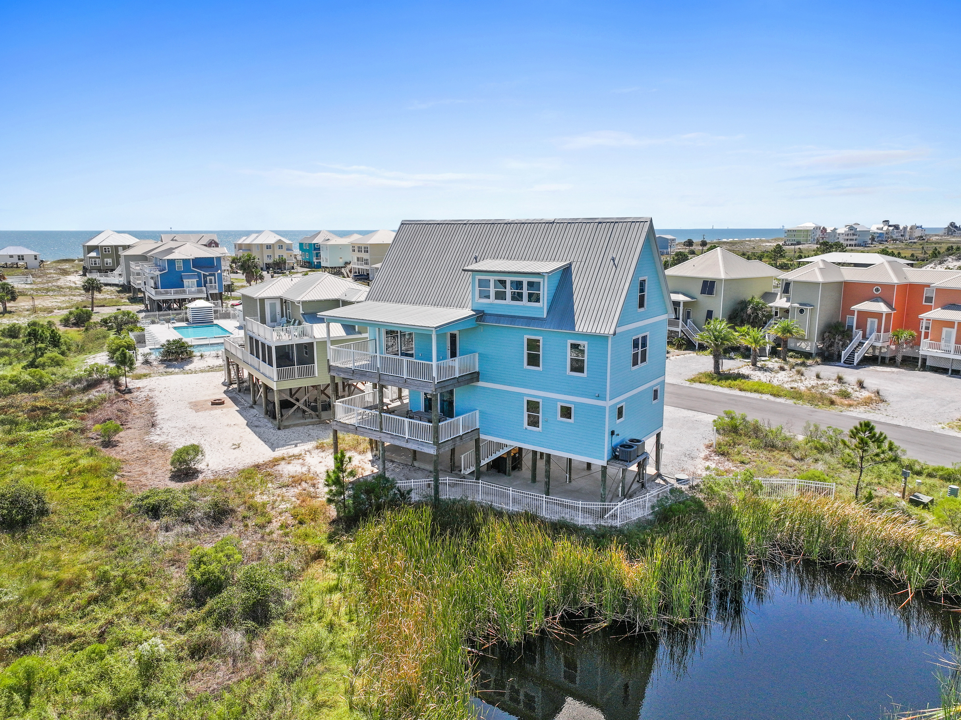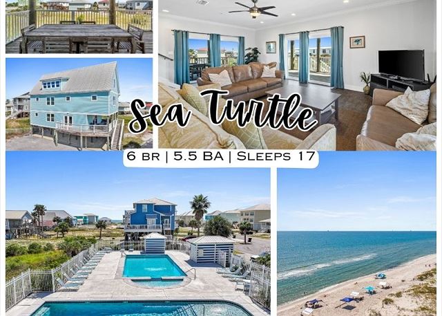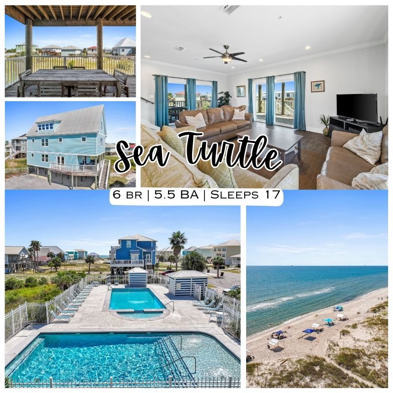 Welcome to SEA TURTLE, a beautifully decorated 6-bedroom, 5.5-bath Fort Morgan home designed for families and groups. Sleeping up to 17, this home features Gulf and bay views from nearly every room, multiple decks, and a spacious loft with flexible sleeping options including bunk beds, trundle, sleeper sofas, and rollaway beds. Each bedroom has its own TV, and Wi-Fi is available throughout. Relax on the first-floor deck, enjoy bay fishing, or take a short 120-yard walk to the beach where you may spot dolphins. The home is surrounded by tropical greenery and white sand beaches, blending privacy with convenience. A fully equipped kitchen and multiple living areas make this home ideal for family gatherings and entertaining.