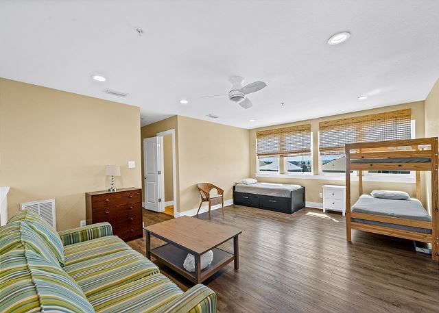 THIRD FLOOR: Loft area with queen sleeper sofa, bunk beds with trundle, additional queen bedroom, full bath, and panoramic views of the island and water