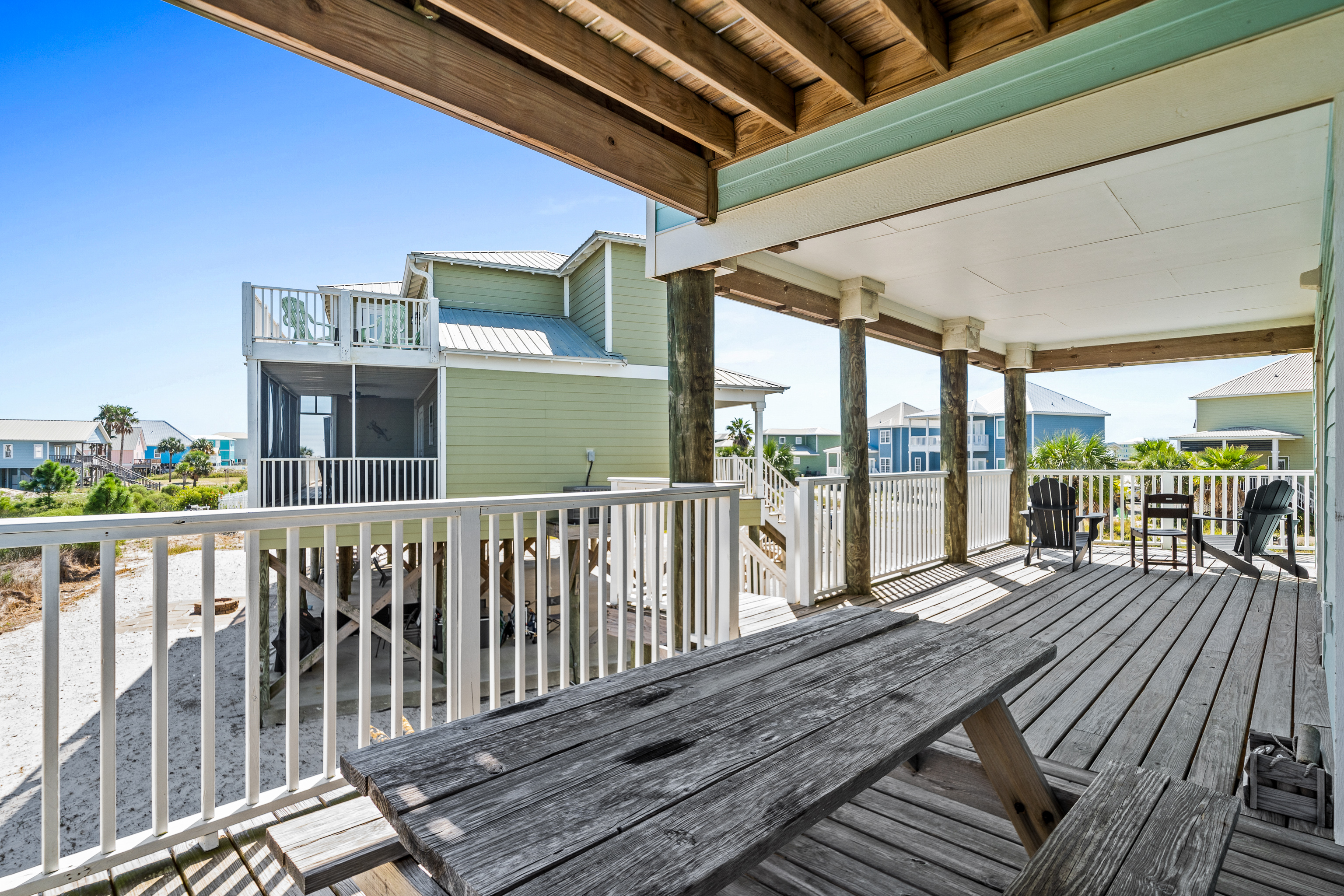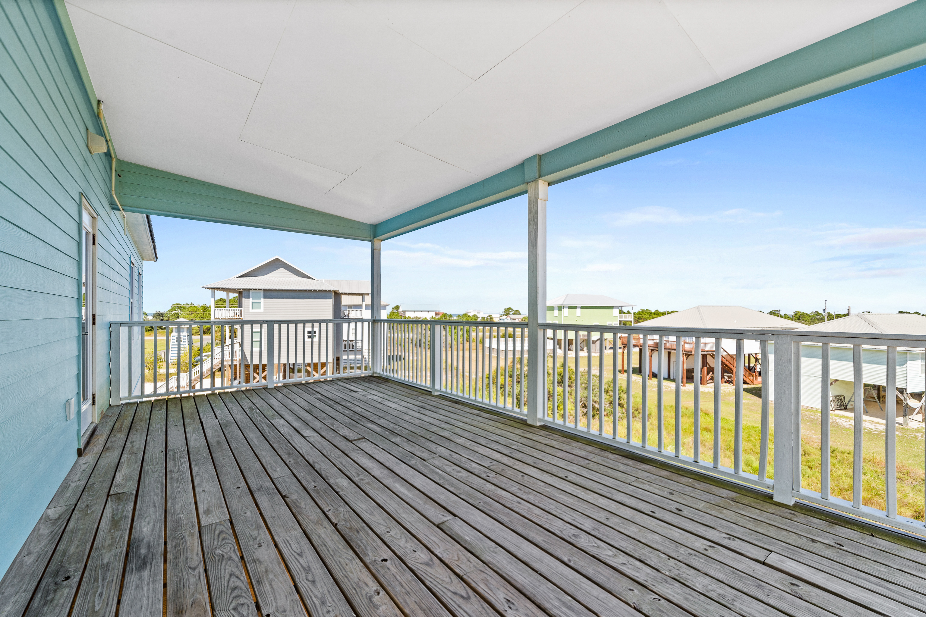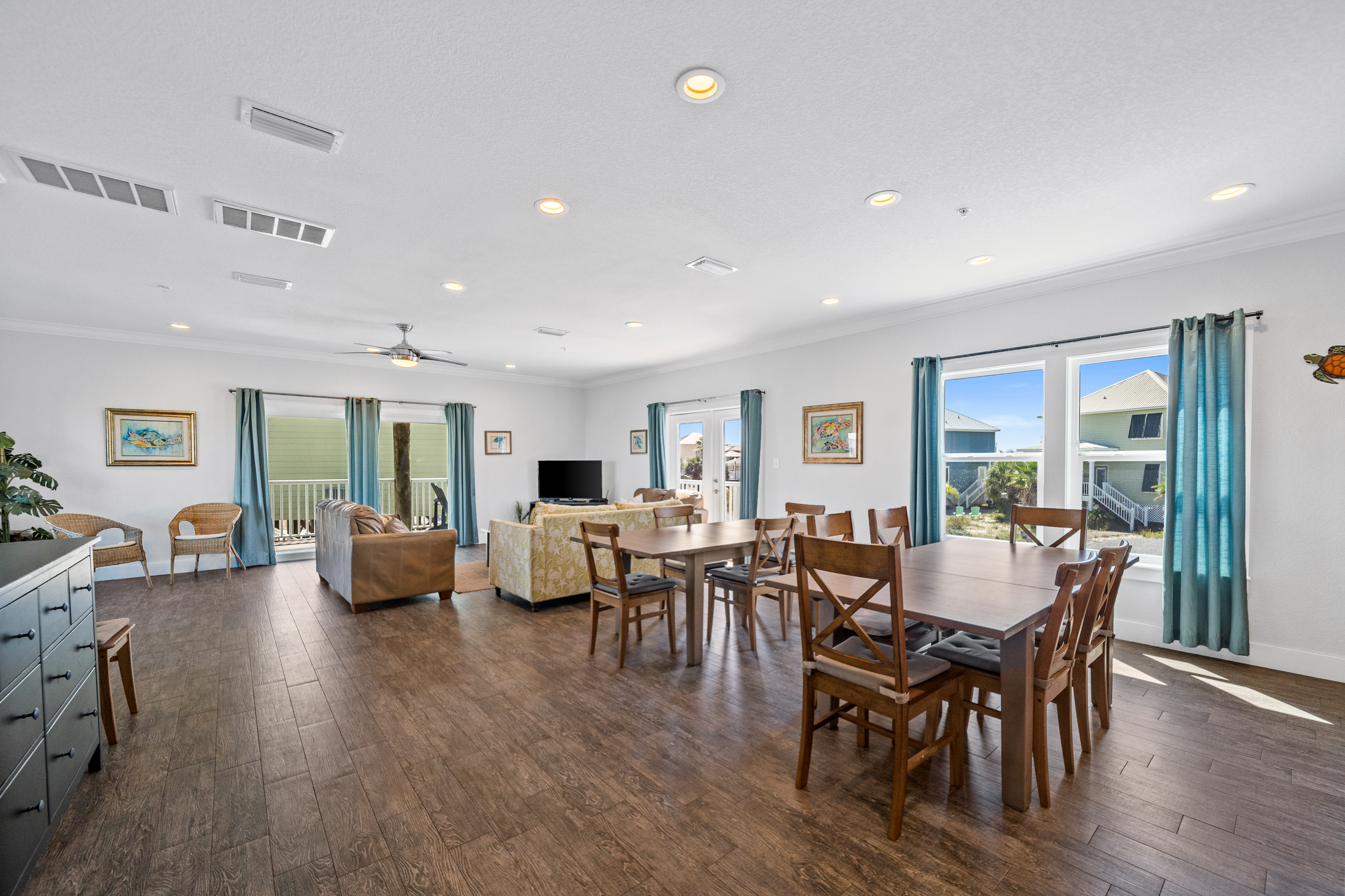 FIRST FLOOR: Entry-level kitchen, dining, living area, laundry room, half bath, and wraparound deck with Gulf and bay views