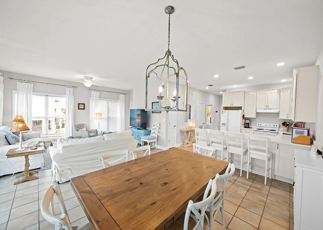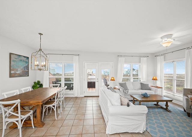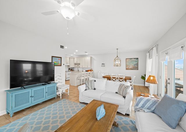 LIVING & DINING AREA: Open living space with large flatscreen TV, dining area, and access to furnished deck