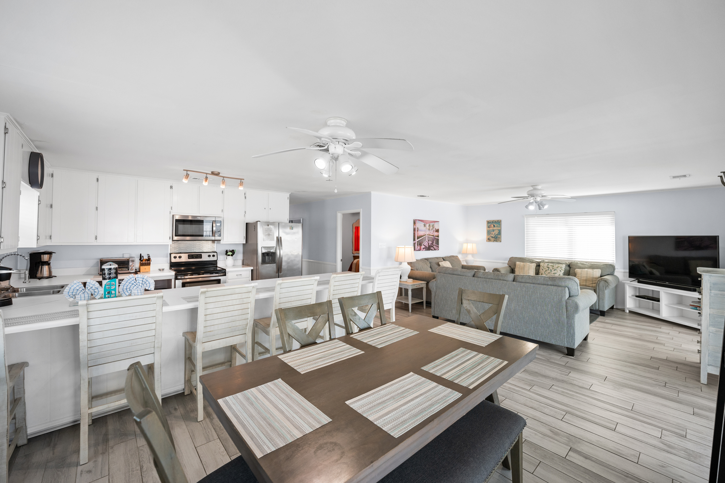 - Open kitchen and living area with dining and bar seating, big-screen TV, and games