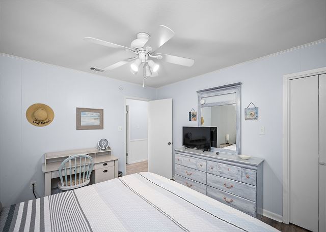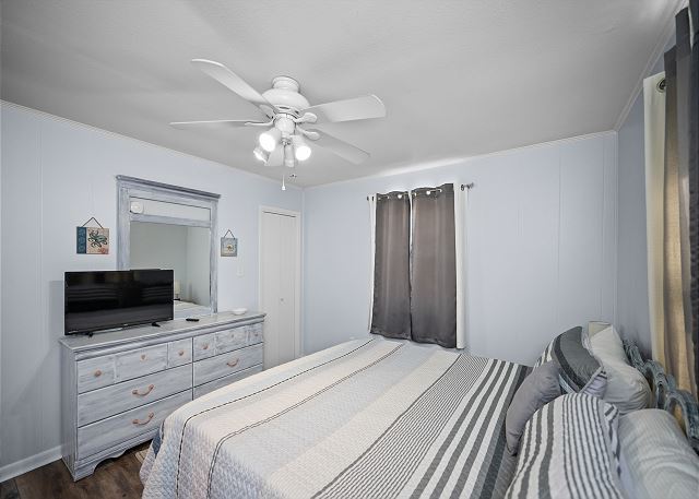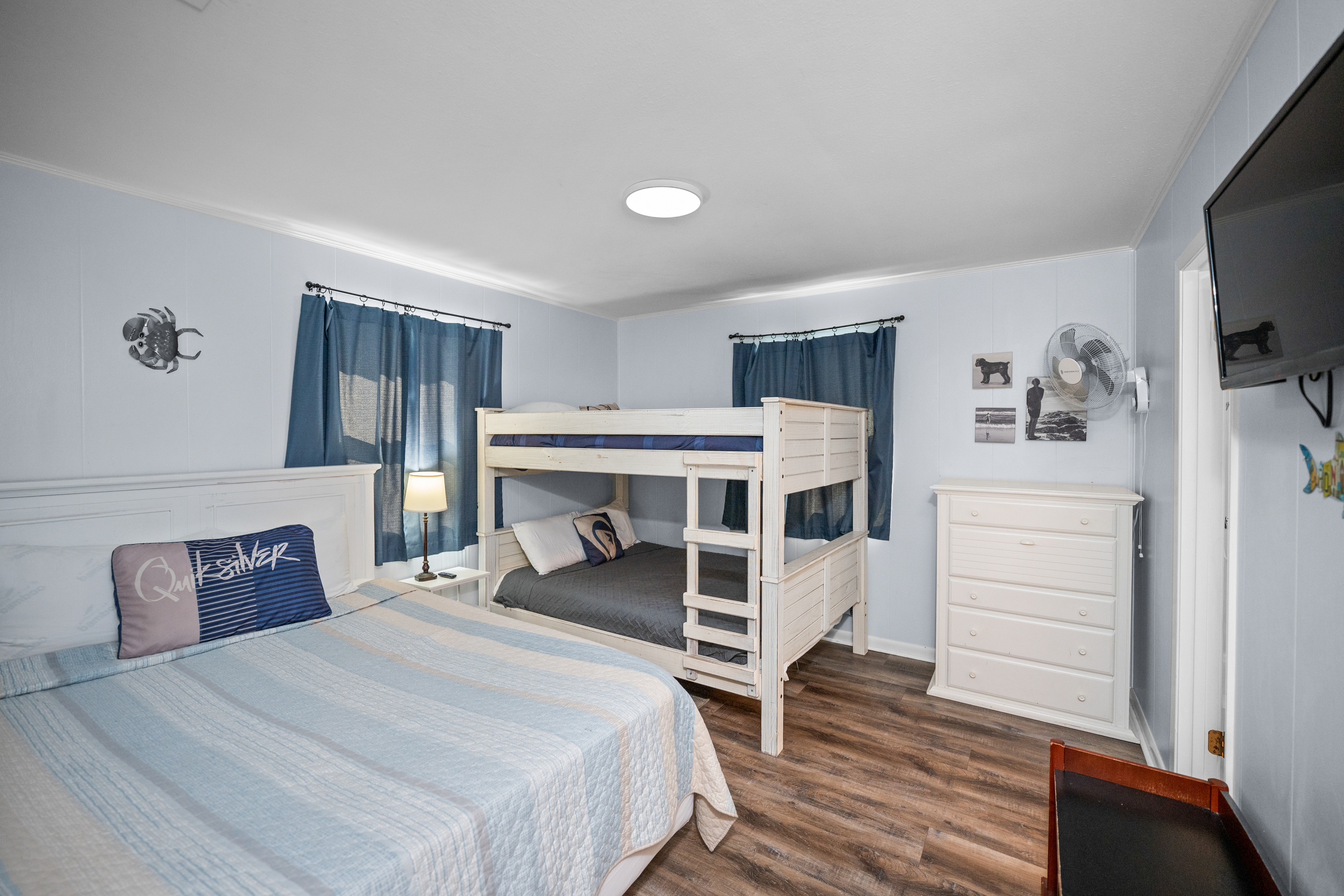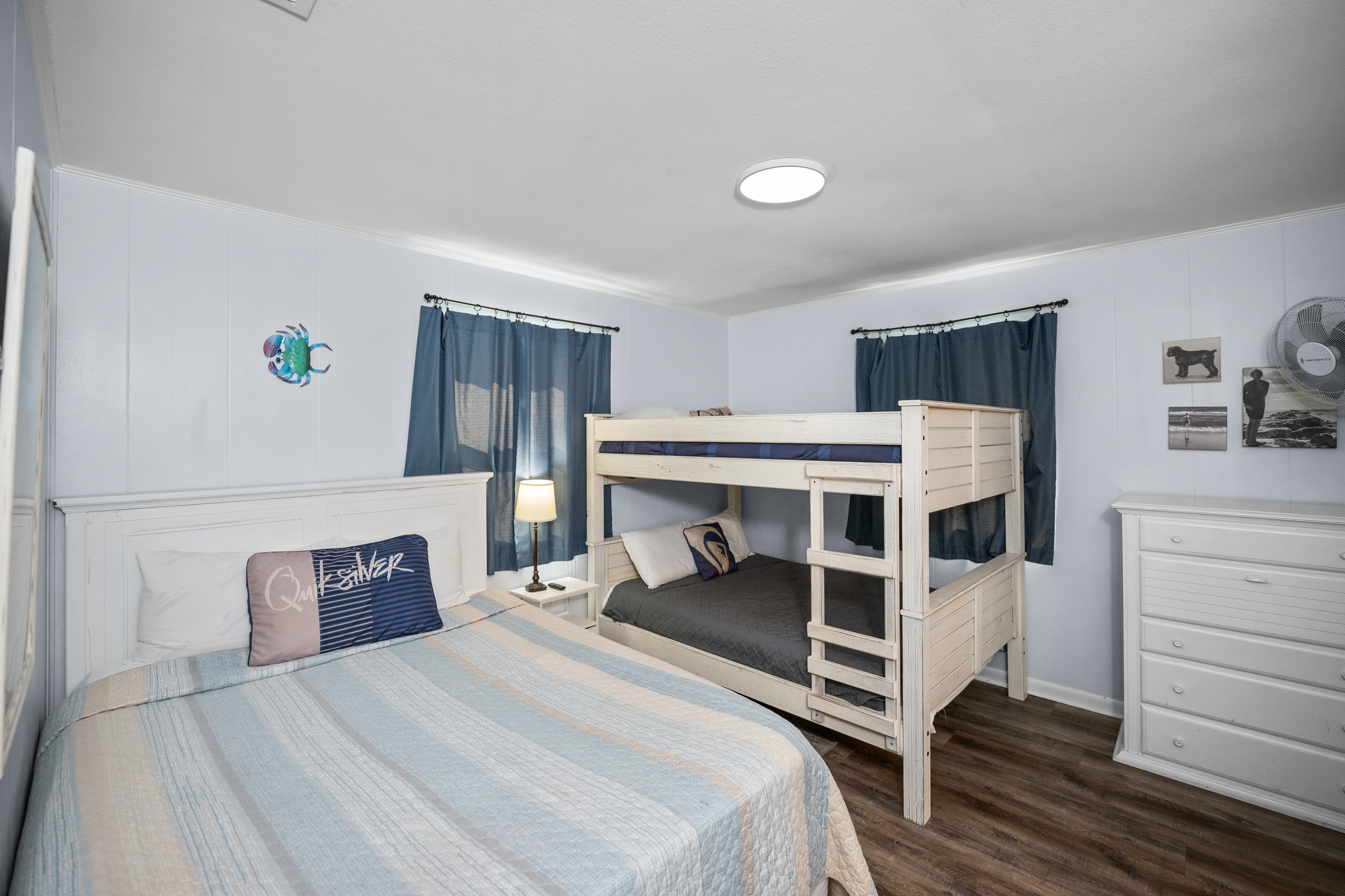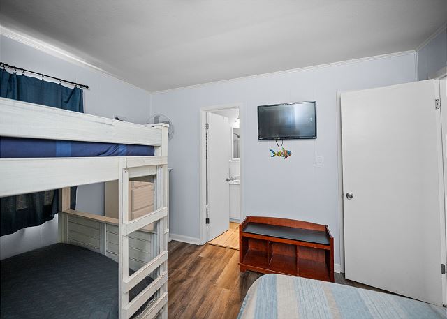 - First bedroom with twin bunk beds and queen bed; second and third bedrooms with king beds