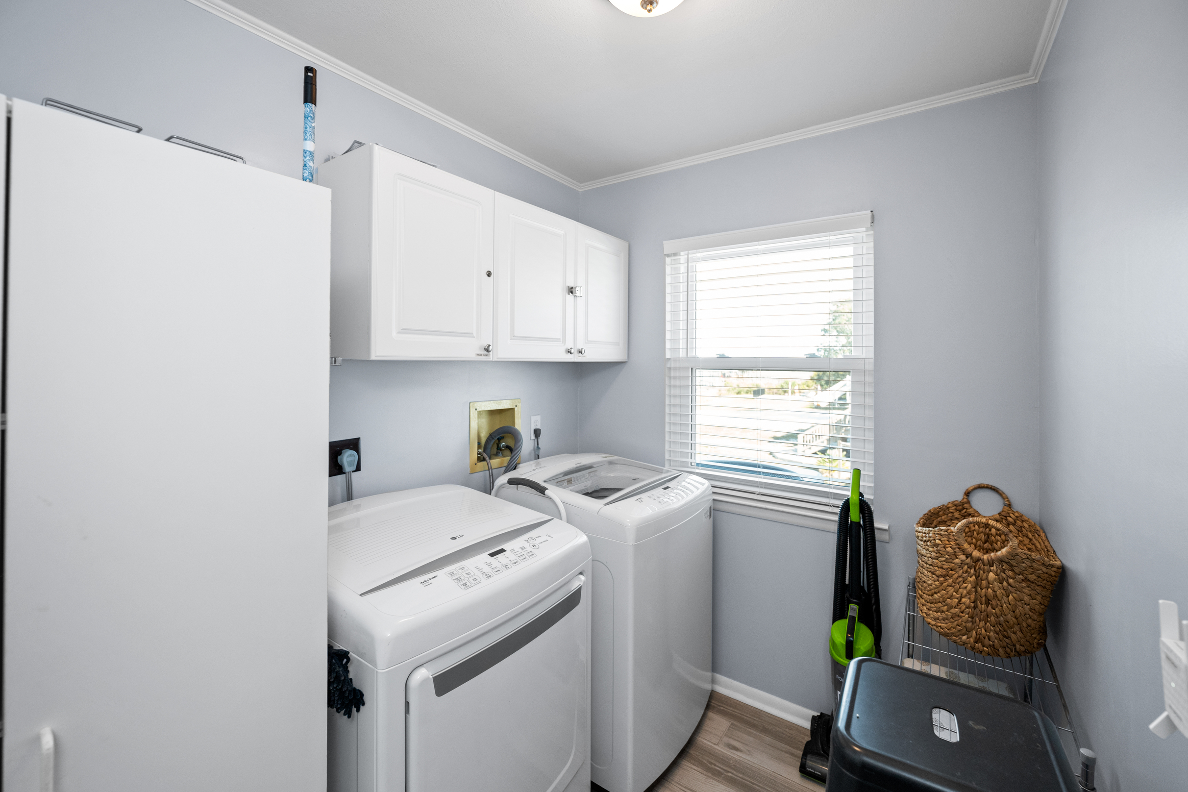 FIRST FLOOR: Entry-level hallway leading to bedrooms, Jack-and-Jill bathroom with tub connecting first and second bedrooms, second full bathroom with shower adjacent to third bedroom, laundry room