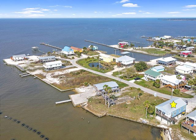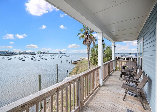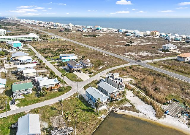 OUTDOOR: Deck overlooking Mobile Bay with water and wildlife views; beach access about two blocks down Ebb Tide Lane