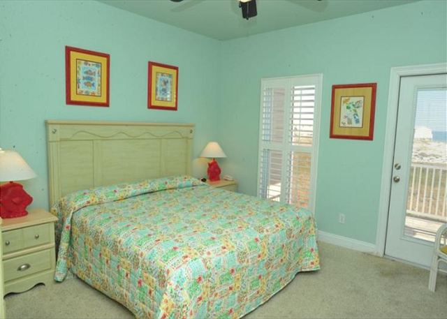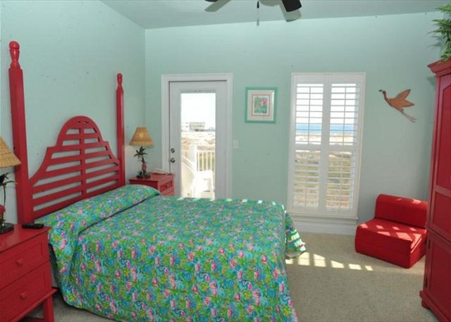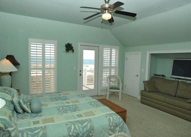 THIRD FLOOR: Master suite with king bed, sleeper sofa, private bath, flat-screen TV, and Gulf-view balcony