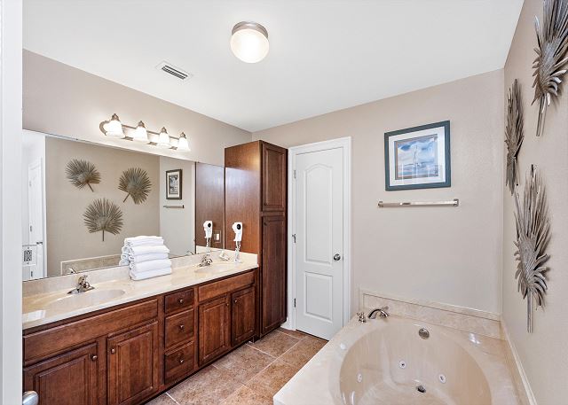 - Primary bedroom with king bed, private bath with tub and standup shower