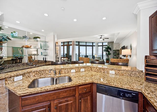 - Fully equipped kitchen, wet bar, and open living/dining area