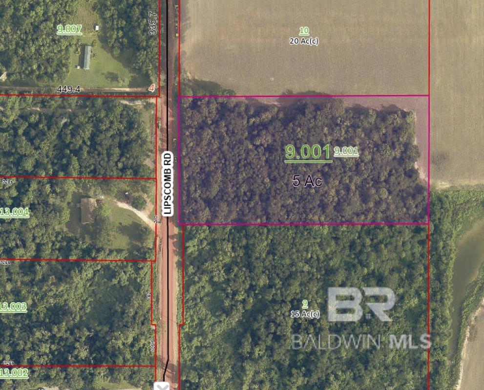 Five(5) beautiful acres of land in Magnolia Springs area between Foley & Fairhope close to Hwy 98. Just minutes from Jesse's Resturant, Oak Street & Magnolia River, which also offers a free dock to fish & launch your canoe or kayack.The entire length of Lipscomb Road has recently been paved within the last year.This rectangler parcel of land is flat & covered in beautiful oak trees planted 30 years ago which allows the buyer privacy & flexibility when clearing the land for their new home.The land is currently unzoned & is in Town of Magnolia Springs police & fire jurisdiction. This location is an hour between Mobile & Pensacola, & 25 minute drive to the Wharf in Orange Beach when using the Beach Express. It is a few miles from downtown Fairhope, Point Clear,& marina at the Fish River Bridge.The property is in the Magnolia Elementary, Foley Middle & Foley High. Public sewer is available at the road or you can have septic tank installed if you choose. There's no water you need to have well water put in. Property information taken from tax records. Buyer & buyer agent to verify any information of importance during due diligence period. Buyer must get financing through a bank Buyer to verify all information during due diligence.