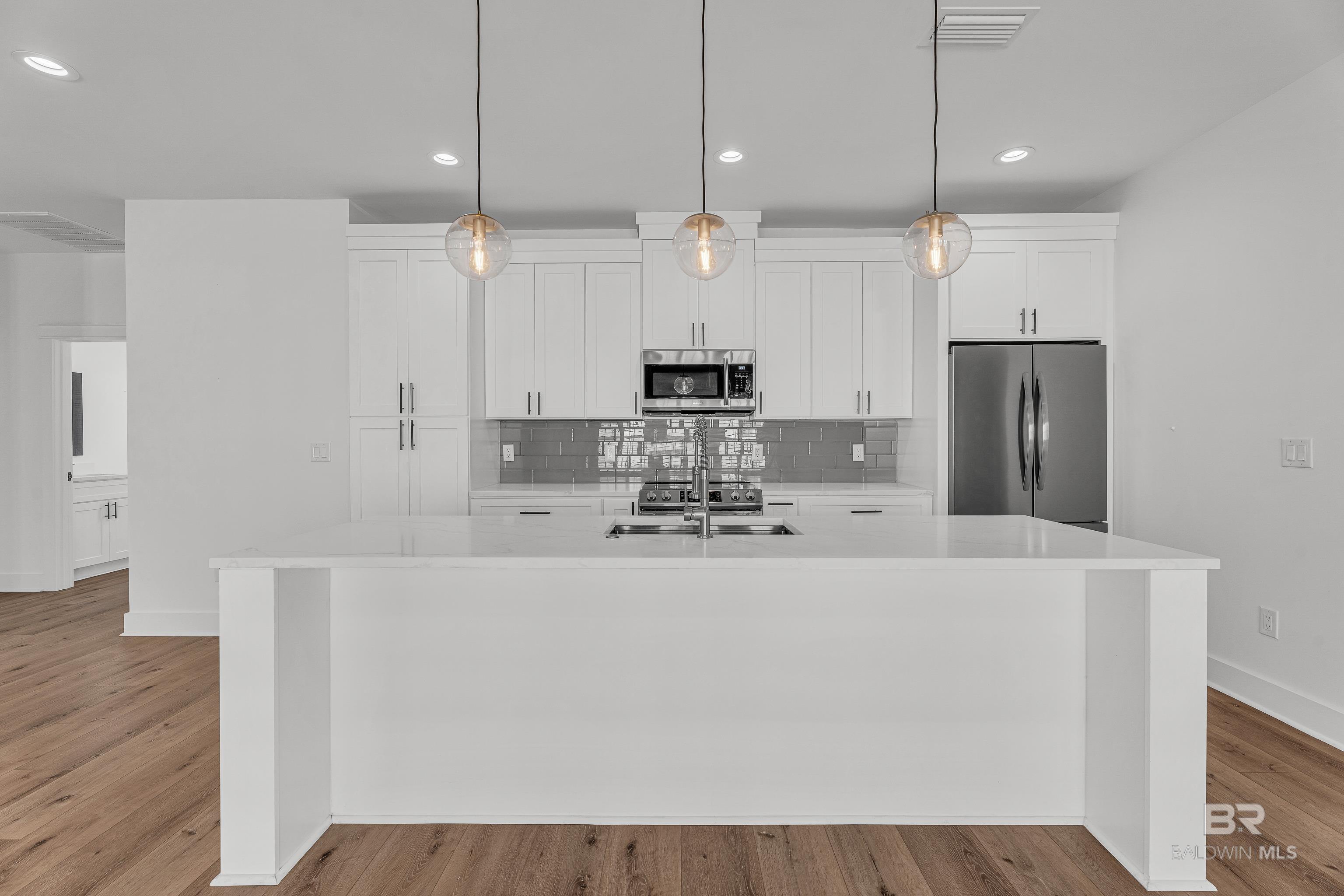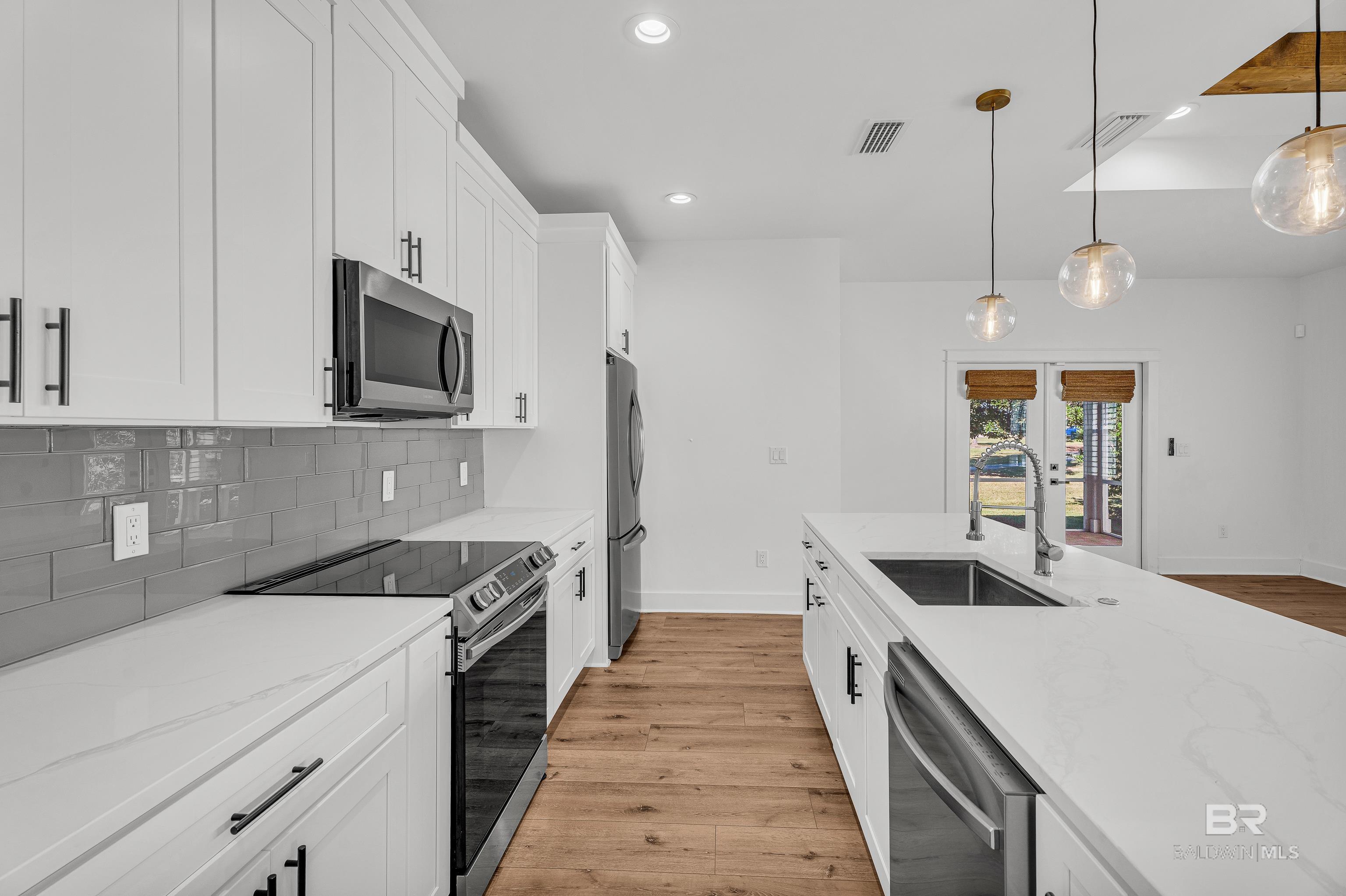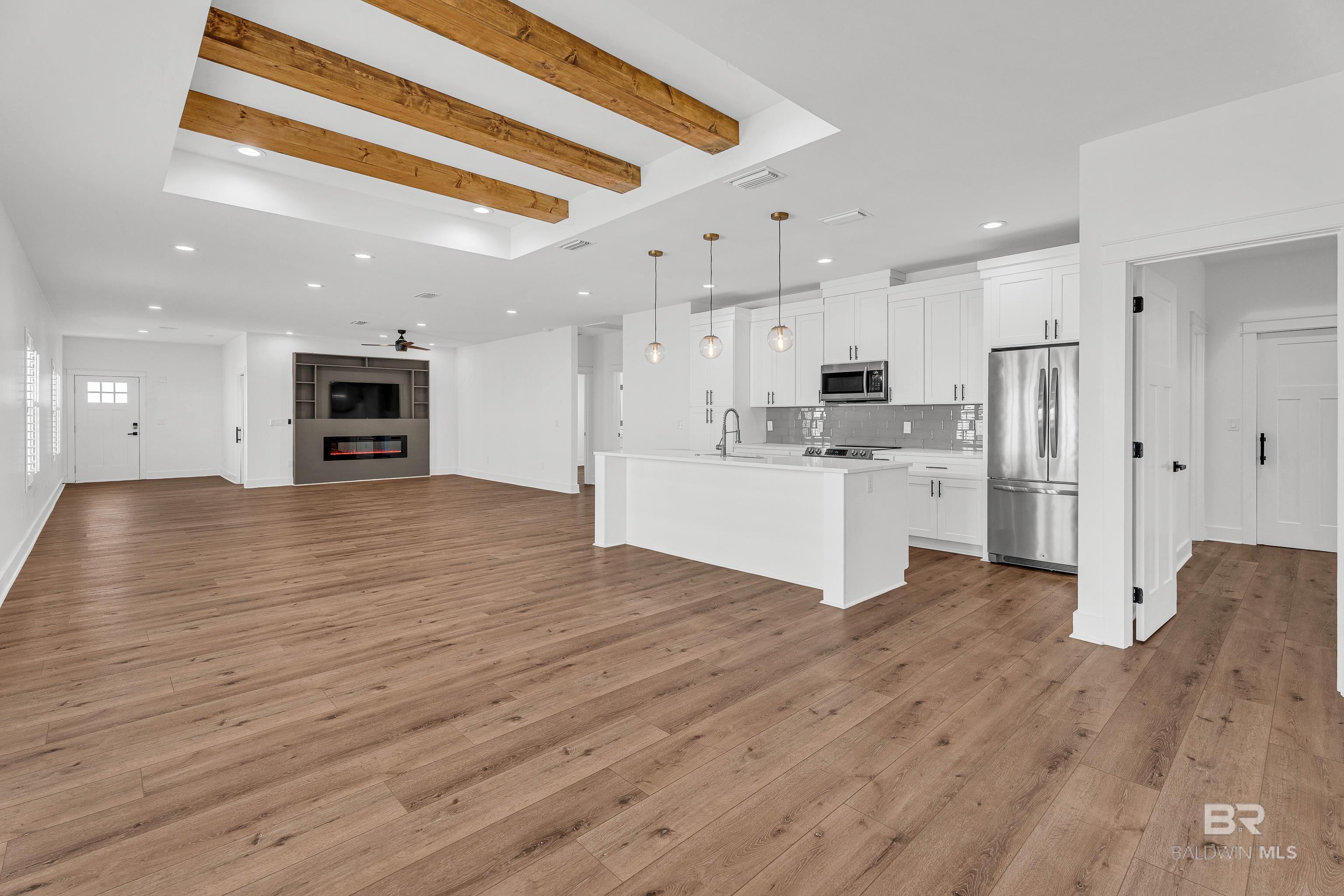Experience the perfect blend of comfort, style & opportunity in this stunning 3BR/2BA GOLD FORTIFIED Beach-Style home in Foley, just 7 miles from the Gulf Shores beaches. Whether you're dreaming of a peaceful coastal retreat, a full-time residence, or a smart vacation rental, this property checks every box. Step inside to an inviting open floor plan with luxury vinyl flooring throughout—NO carpet! Recessed lighting & ceiling fans in every bedroom & the living room create a bright, breezy feel. The living room features built-in shelves, perfect for showcasing your treasures, plus a modern electric fireplace with a remote to change colors & add warmth or ambiance. The kitchen is a showstopper with a large island & farm sink, quartz countertops, tiled backsplash, & soft-close drawers. The dining room boasts a tray ceiling with wood beams, adding coastal charm. Retreat to the primary suite with a trey ceiling, a dual-entry walk-in closet, & an oversized tiled spa shower. Enjoy thoughtful touches like smooth walls & ceilings, wood-shelved closets, & Plantation Shutters, adding timeless elegance. Even the Laundry room has a touch of elegance, with a pocket door, window & quartz counter & sink, conveniently located off the garage. The Hardie Board exterior & metal roof adds durability & coastal appeal. Step out to the spacious screened-in porch, where peace & quiet abound, perfect for a cup of coffee or entertaining friends, as you look over lush green space with walking trails lined with crepe myrtles & magnolias. With SHORT-TERM RENTALS allowed, this home offers flexibility—generate income when you’re away or savor the quiet coastal lifestyle year-round. Coastal living, smart investing, & everyday comfort all come together here. Located minutes to Gulf Shores & Orange Beach Entertainment, Restaurants & beaches, with easy access to hospitals, airports. TVs, refrig. W/D to stay. Buyer to verify all information during due diligence.