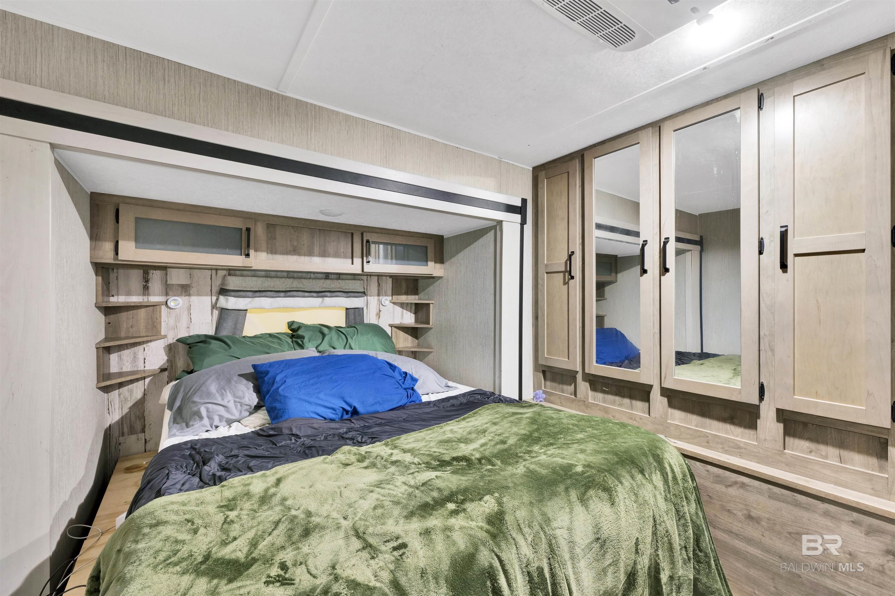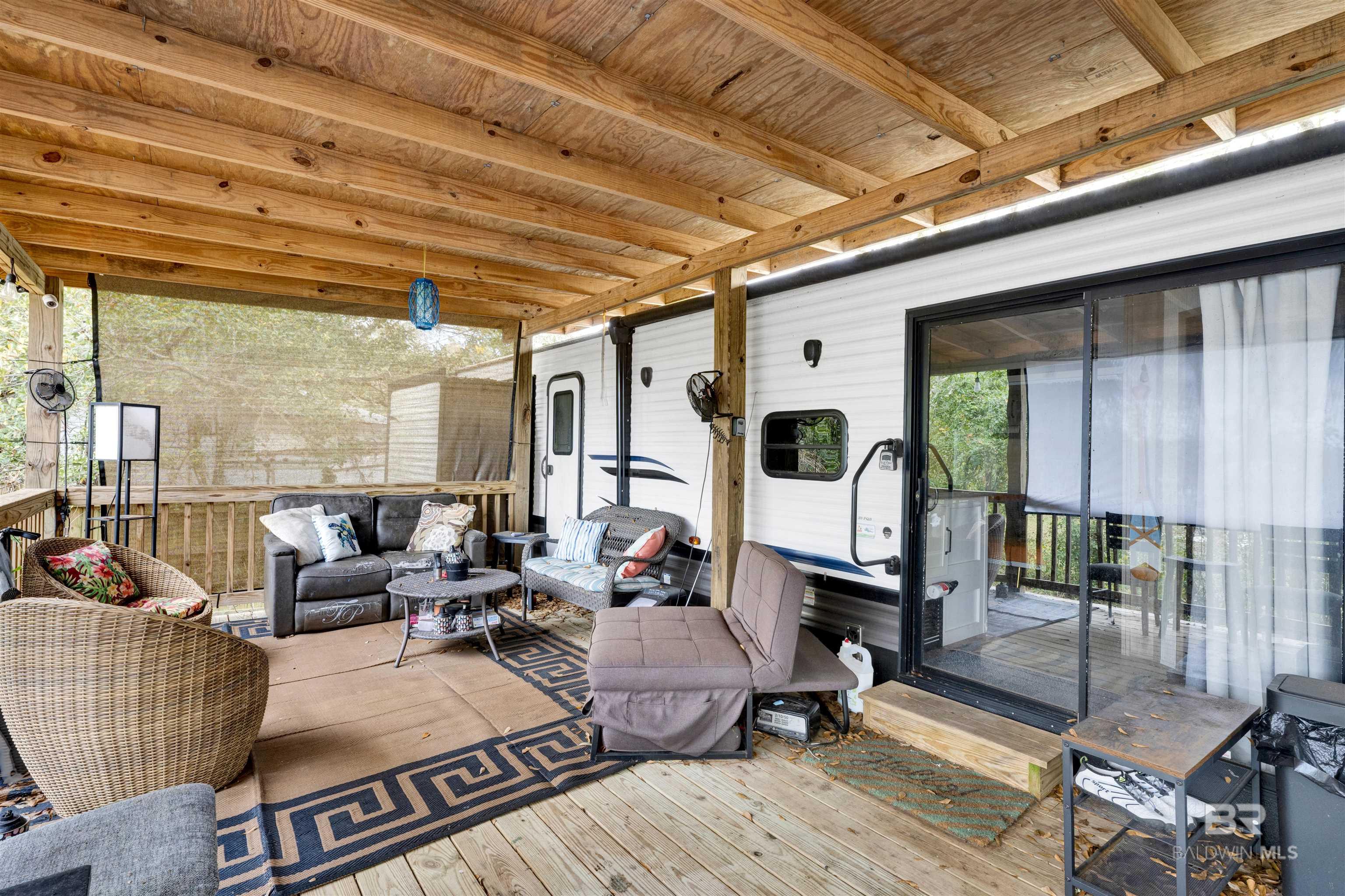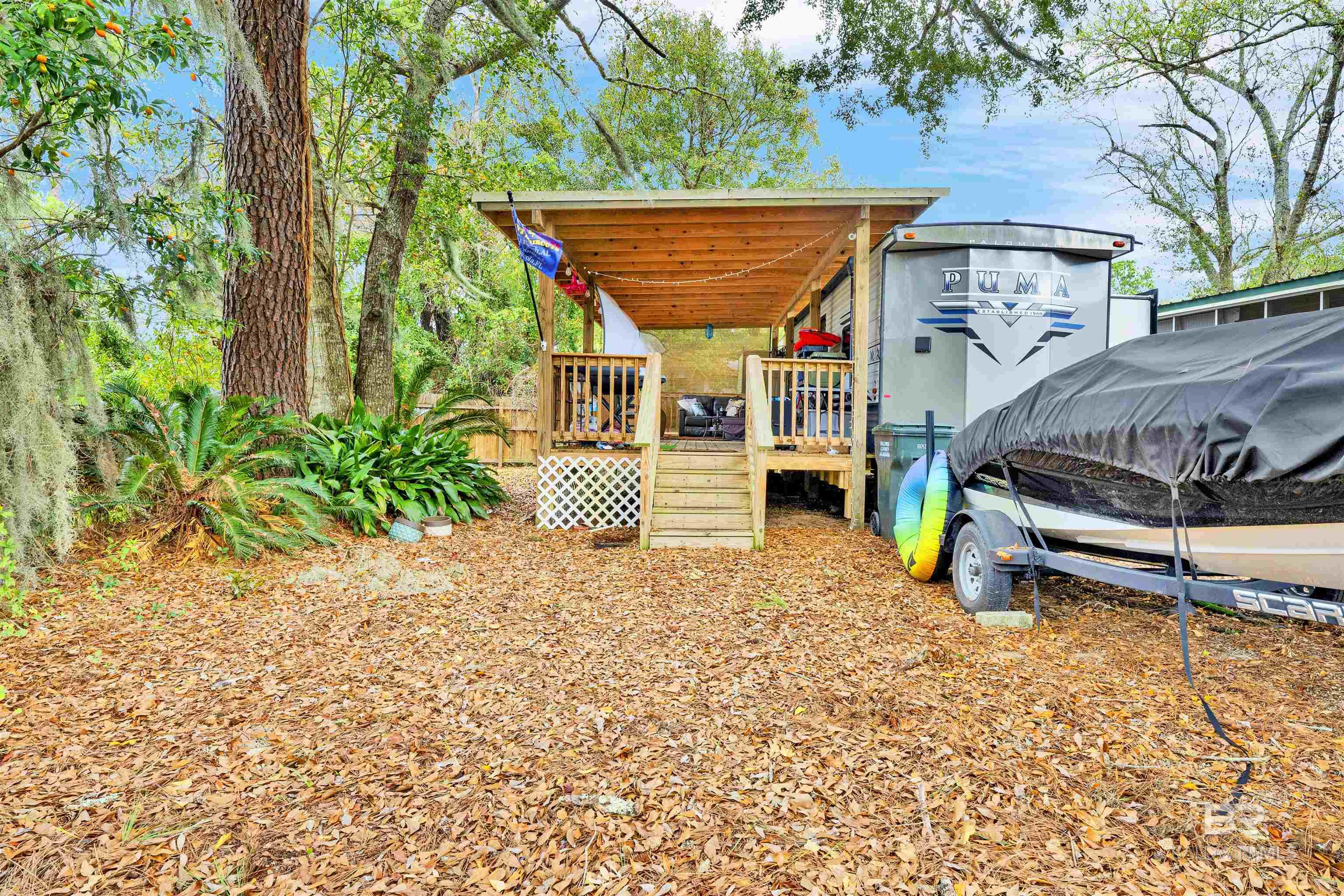 STUNNING SUNSET VIEWS OVER THE WATER RIGHT FROM YOUR PORCH! Not your normal RV lot and lots in this subdivision don't come up often! Move-in ready with direct views of the Bon Secour River from the spacious 30' x 14' covered deck. This property features a 2021 Puma RV (approx. 450 sq. ft. living area) offering 2 bedrooms and 1.5 baths, positioned on one of the most desirable lots—Lot 12 on Pirate Circle. Added space to allow for 8 guests. The 108' x 38' lot showcases mature palms, live oaks, and fruit trees, plus 50-amp service, city utilities, and garbage service. Ideal for weekend escapes or investment use, with both short-term and long-term rentals permitted. Located half a mile from the new $4M public boat launch at County Road 6 and just 6 miles from Gulf Shores Public Beach. Vacant and easy to show today. Buyer to verify all information during due diligence.