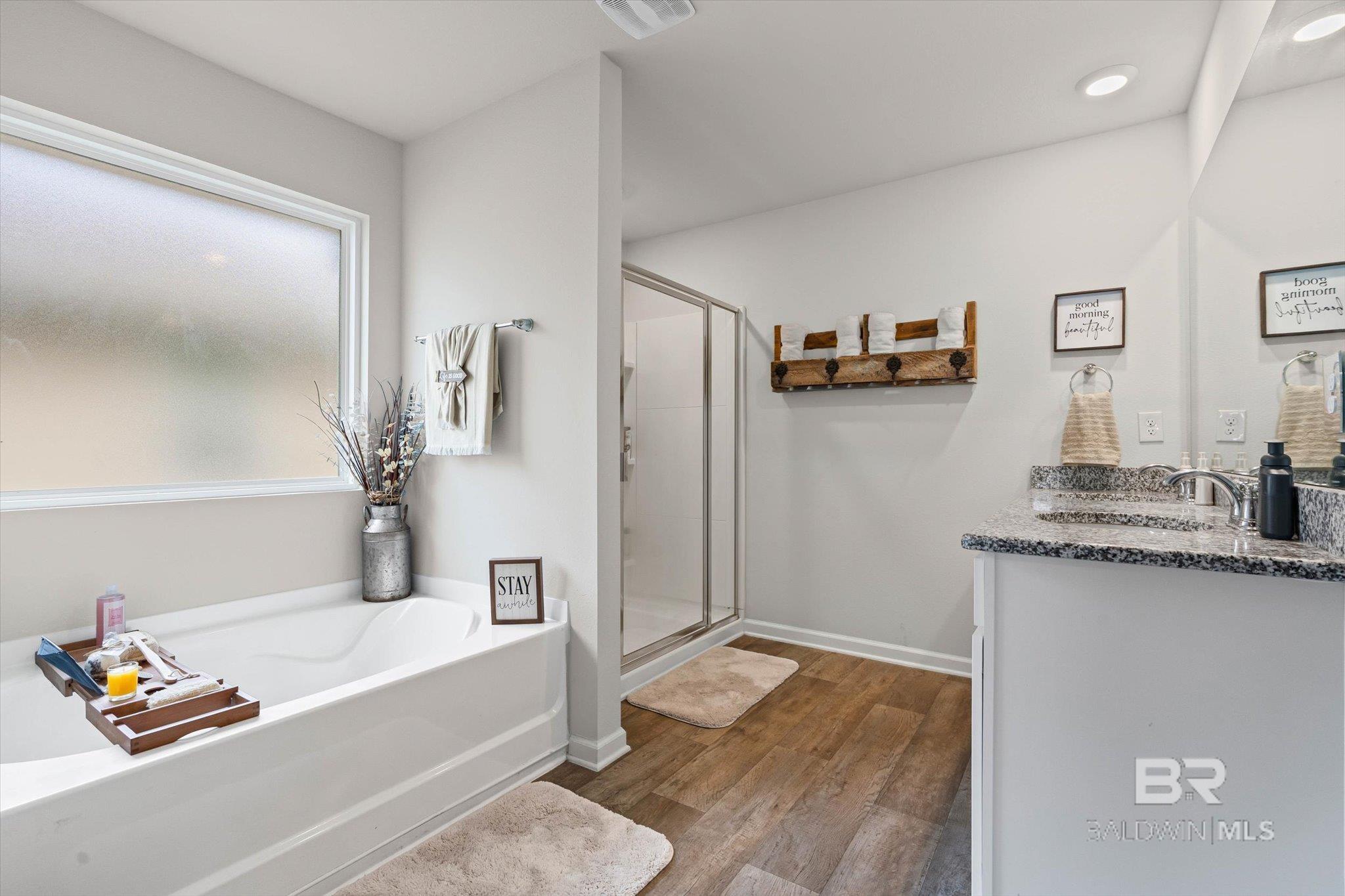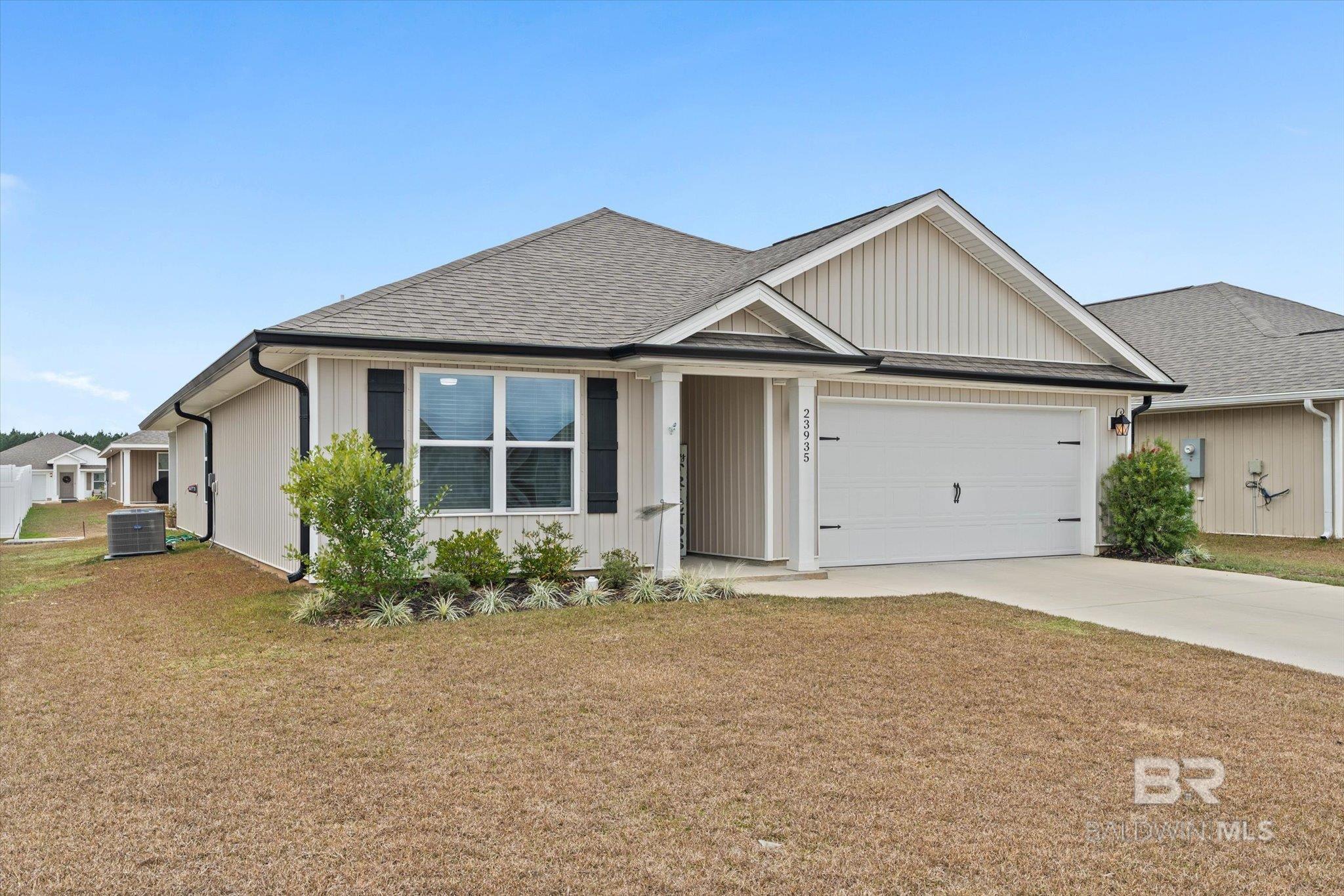 Just reduced, and the seller is MOTIVATED, Craftsman home in Jubilee Farms built in 2023, FORTIFED GOLD BUILT HOME. This 3-bedroom, 2-bath residence features an open-concept floor plan, split bedrooms, and abundant natural light throughout. The kitchen offers modern appliances and ample cabinetry with seamless flow into the living area. The primary suite includes a walk-in closet, double vanity, garden tub, and separate shower. Additional highlights include vinyl flooring, covered patio, attached double garage, (again) Fortified Gold construction, full gutter system, and a landscaped yard. Community amenities include an outdoor pool with convenient access to shopping, dining, schools, and I-10. Buyer to verify all information during due diligence.