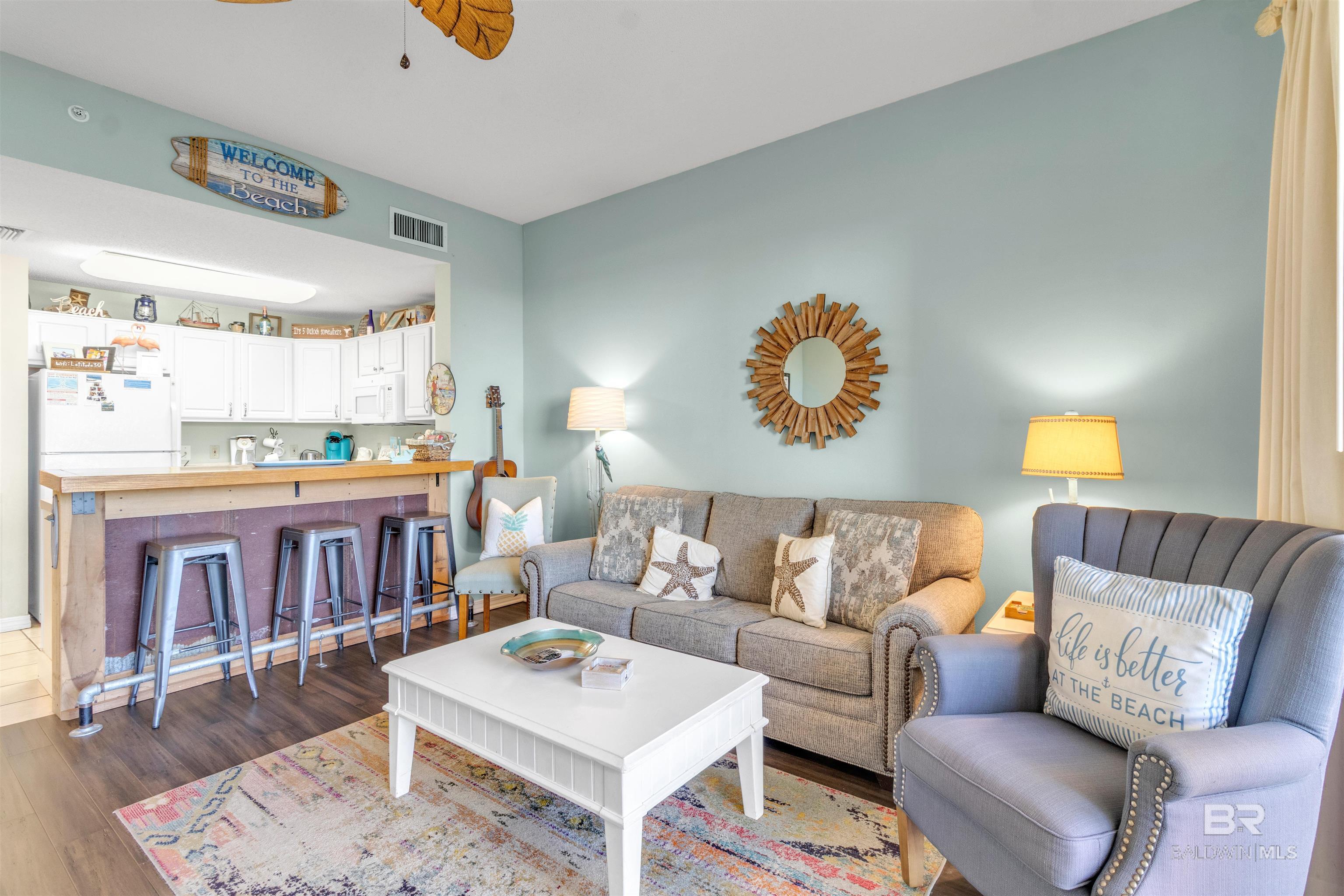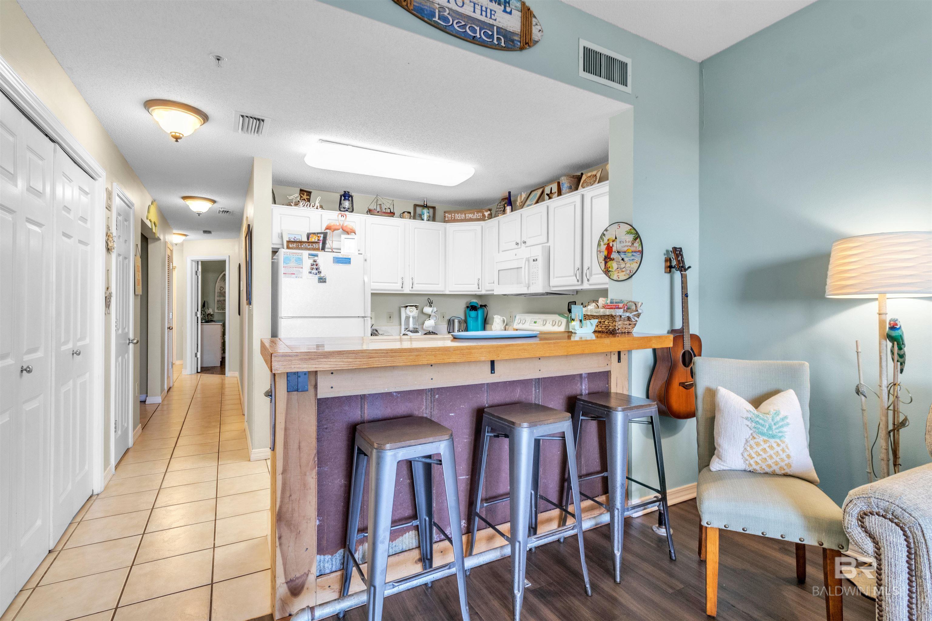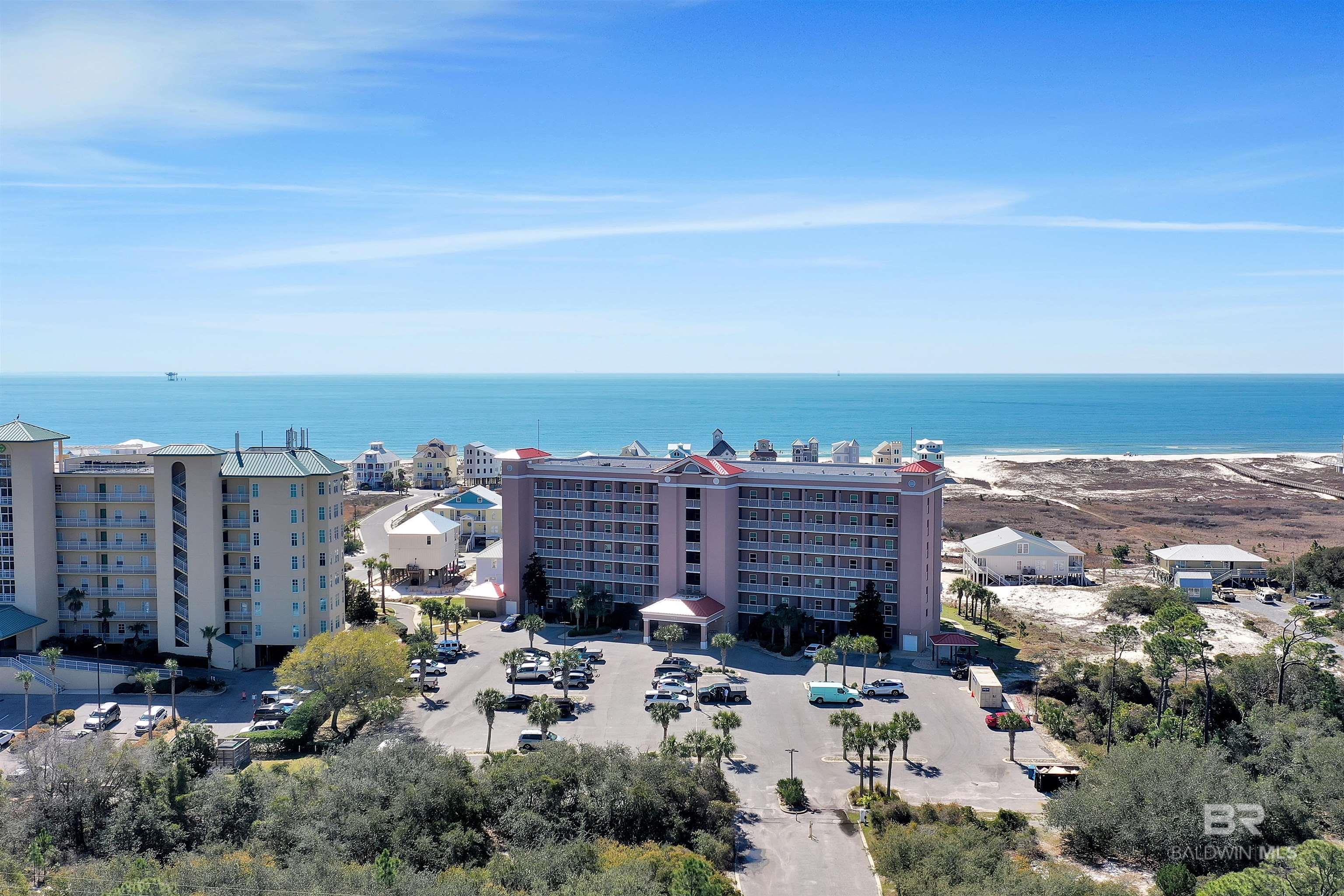 If you're looking for a condo where you can BRING YOUR DOGS and TAKE YOUR DOGS ON THE BEACH - THIS IS IT! 1-BR beachfront condo with BONUS HALL BUNKS. The Dunes is pet-friendly for owners and it's a less crowed peaceful area away from all the hustle and bustle. Open living area with an updated slider door that allows access to the Balcony and captures breathtaking views! The Bedroom has a King Bed and ensuite bath. And there's a second Full Bathroom across from the hall bunks. With a sleeper sofa, this unit is designed to sleep 6. Owners are allowed golf carts, with a designated parking area, making it a quick golf cart ride or an easy stroll to the beach. The Dunes is a gated community and amenities include beach access, an Outdoor Pool with a swim-through to an Indoor Pool, a fitness room, and BBQ grilling area. Tacky Jacks Restaurant is across the street and Fort Morgan Marina - where you can charter a deep-sea fishing trip, hop on a dolphin or sunset cruise, or rent jet skis. Or you can spend your days exploring nearby Historic Fort Morgan. The condo has a new roof, new windows and sliding doors. Buyer to verify all information during due diligence.