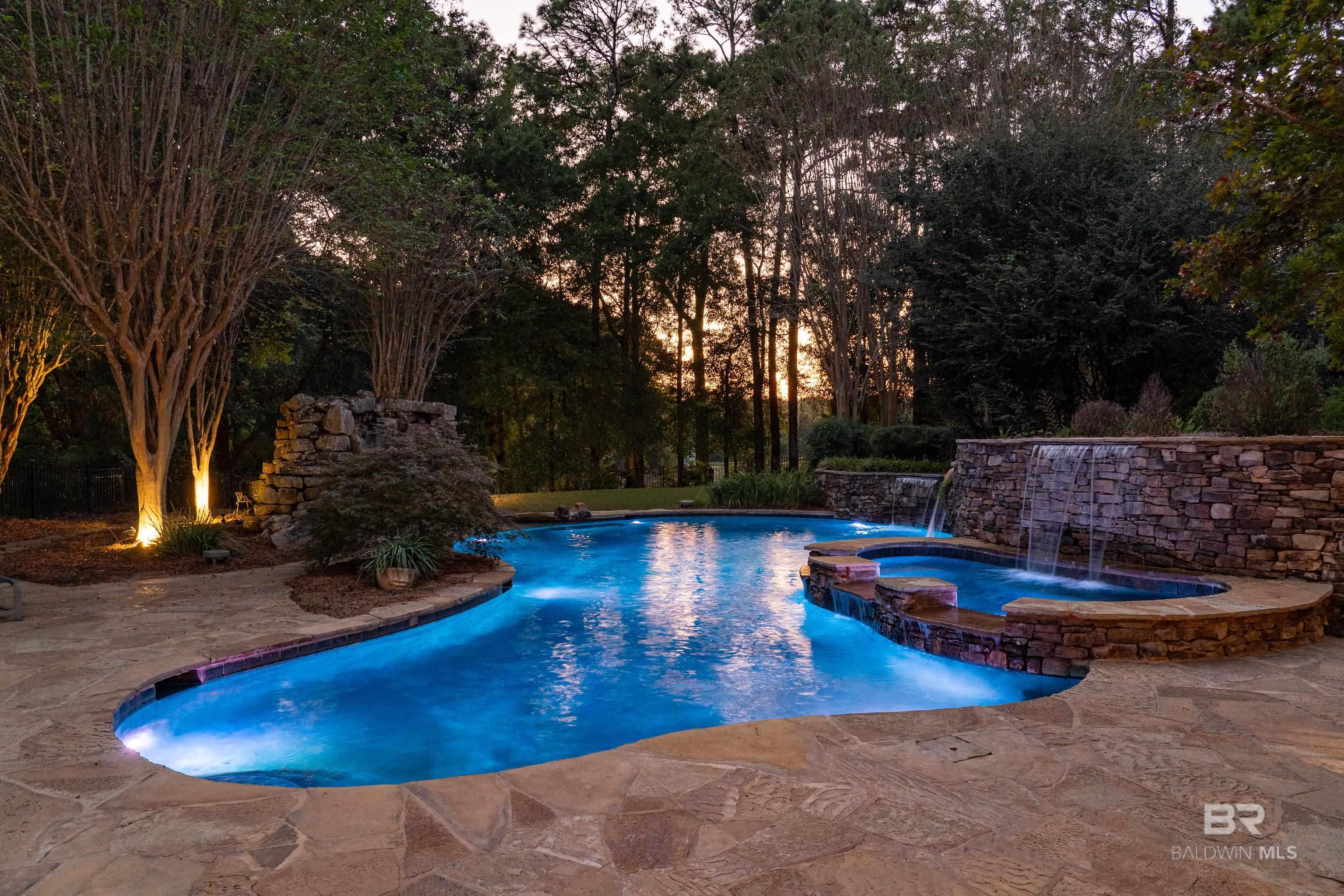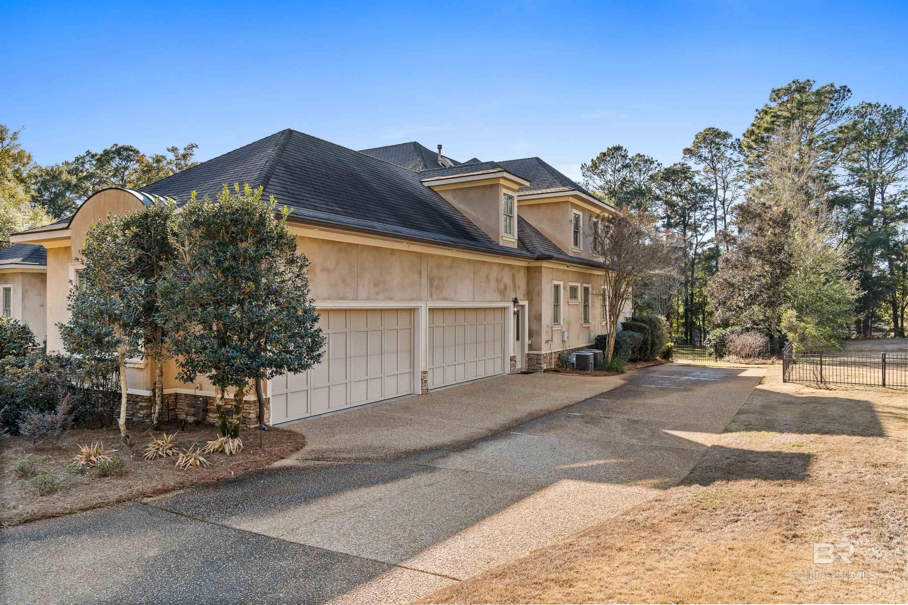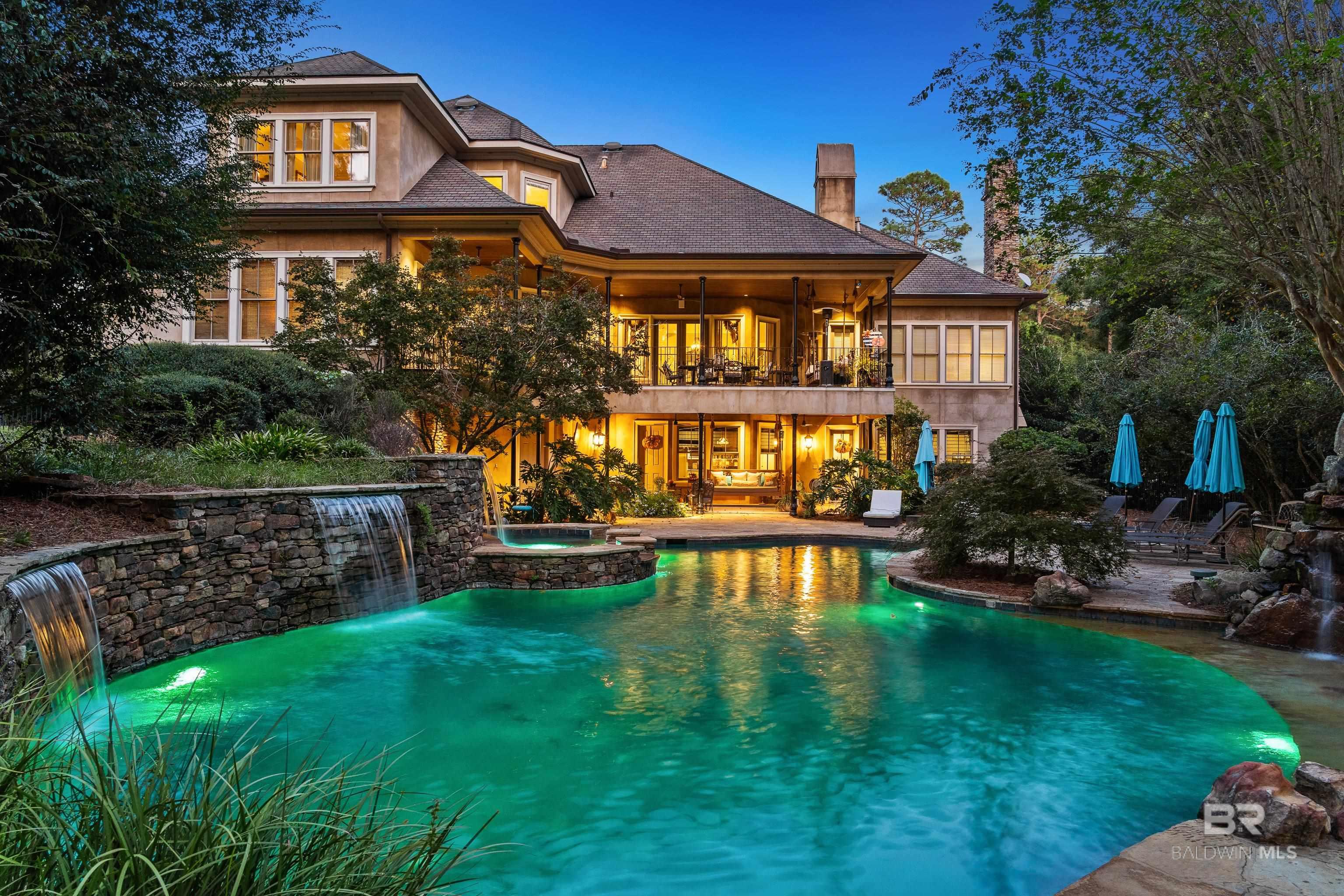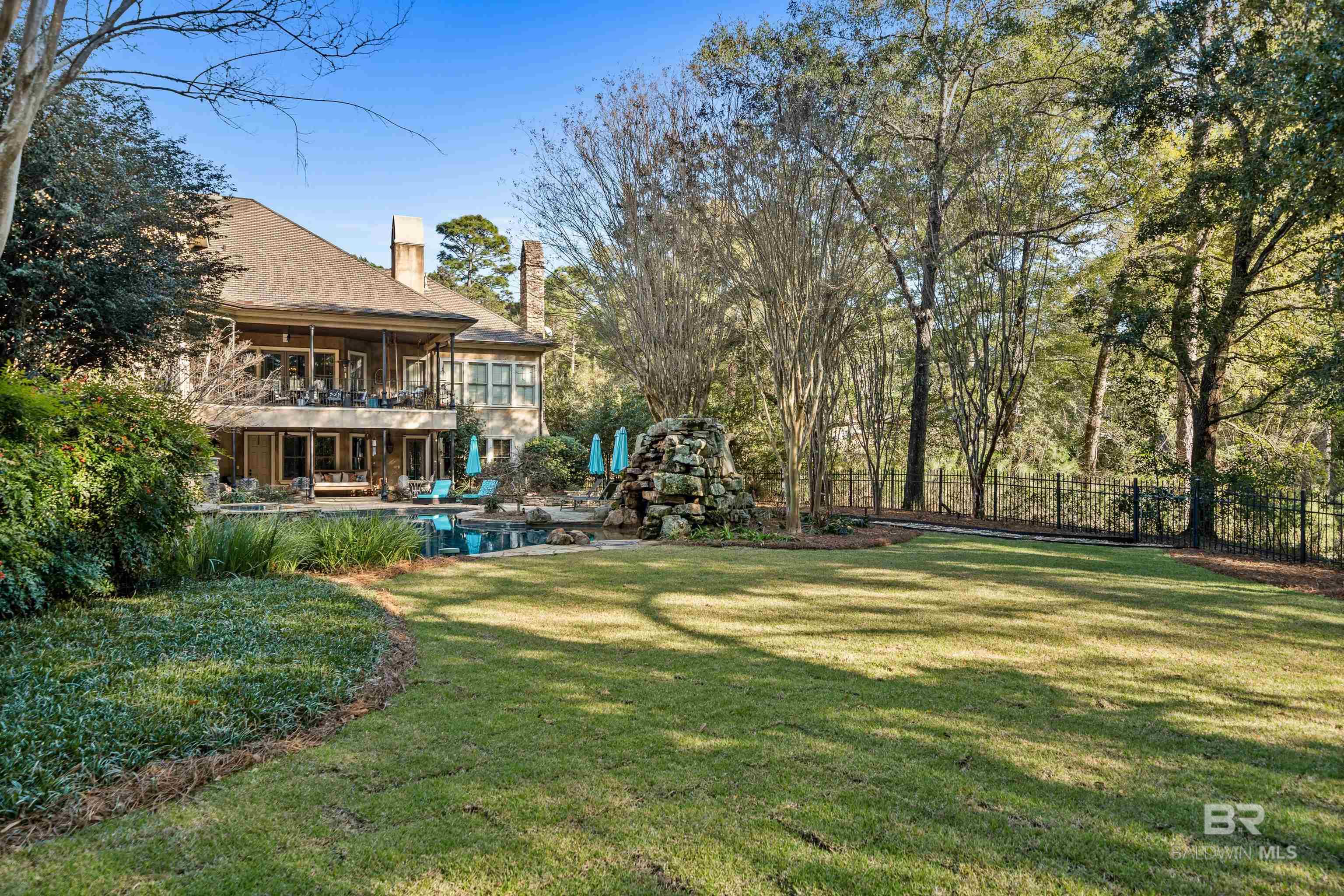 Tucked along the Rock Creek Golf Course in Fairhope, this exquisite French Country estate offers a rare blend of privacy, elegance, and resort-style living. From the moment you arrive, the home impresses with all-new professional landscaping featuring lush zoysia sod, fruit trees, updated drainage, irrigation, and beautifully lighted pathways that frame both the front and backyard. Inside, Brazilian teak floors span two levels, setting a warm and luxurious tone throughout. Four fireplaces add character and comfort, while abundant natural light fills the home. Thoughtful spaces include a dedicated home office, relaxing covered porches, and an effortless flow designed for both everyday living and entertaining. The open-concept kitchen is a true centerpiece, equipped with a stainless steel gas range, Sub-Zero refrigerator, tile countertops, and seamless connection to the main living areas. The expansive primary suite is a private retreat, featuring double vanities, a pedestal soaking tub, a walk-in shower, and an oversized walk-in closet. Designed for entertaining on a grand scale, the lower level boasts a massive entertainment room that opens directly to the backyard oasis. Complete with a mini kitchen and full bathroom, this level also includes a dedicated home gym with cardio equipment and weights. Step outside to experience the show-stopping resort-style backyard, highlighted by a stunning pool, hot tub, cascading waterfalls, beautiful stonework and an outdoor balcony overlooking the entire space. Smart-home friendly, the residence allows effortless control of thermostats, TVs, whole-home music, garage doors, and LED lighting for the pool, hot tub, and waterfalls. Every detail of this home has been curated to elevate lifestyle and comfort, making it a truly exceptional offering in one of Fairhope’s most cozy golf course communities. Schedule an exclusive showing today and be delighted with the finest luxury amenities. Buyer to verify all information during due Buye