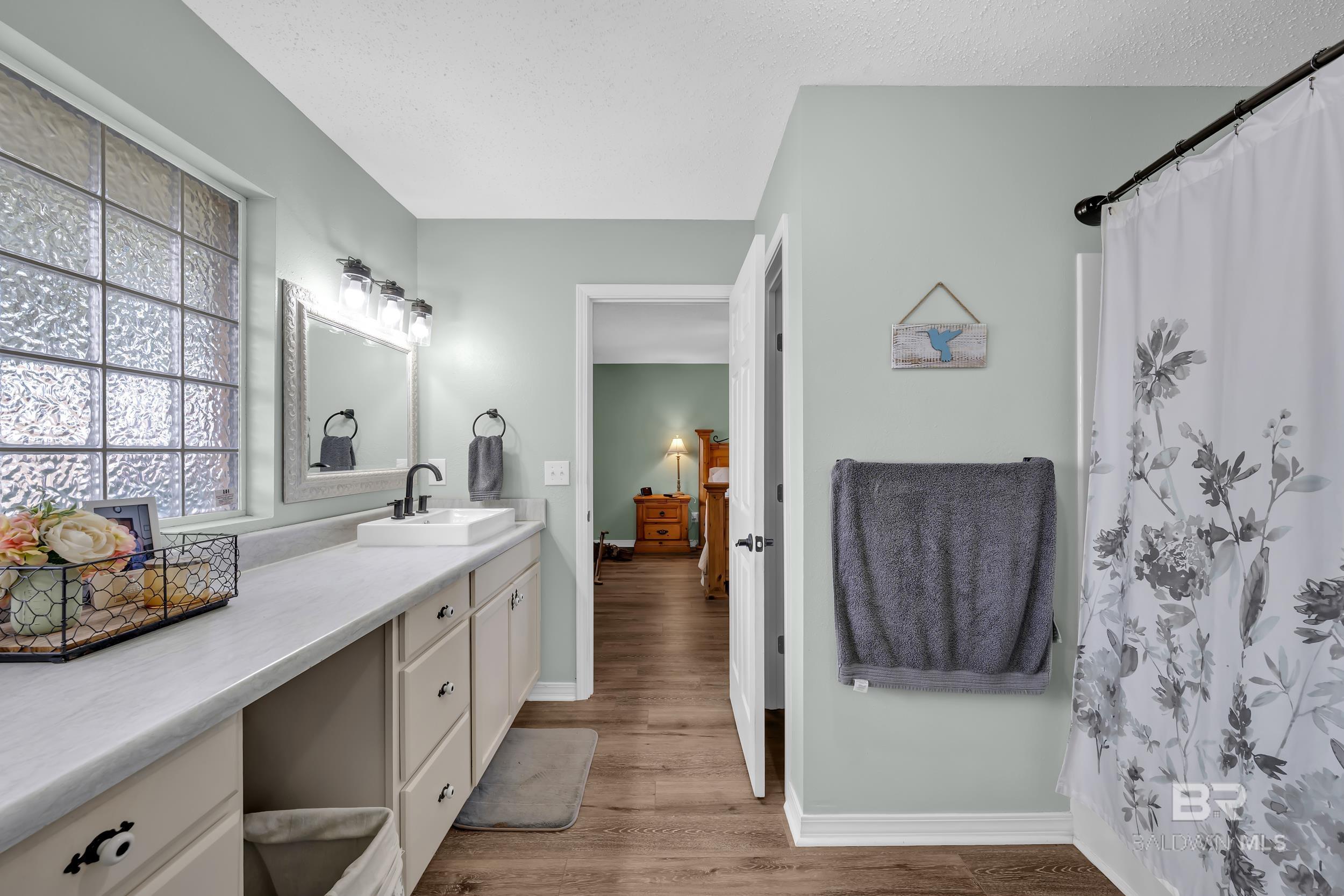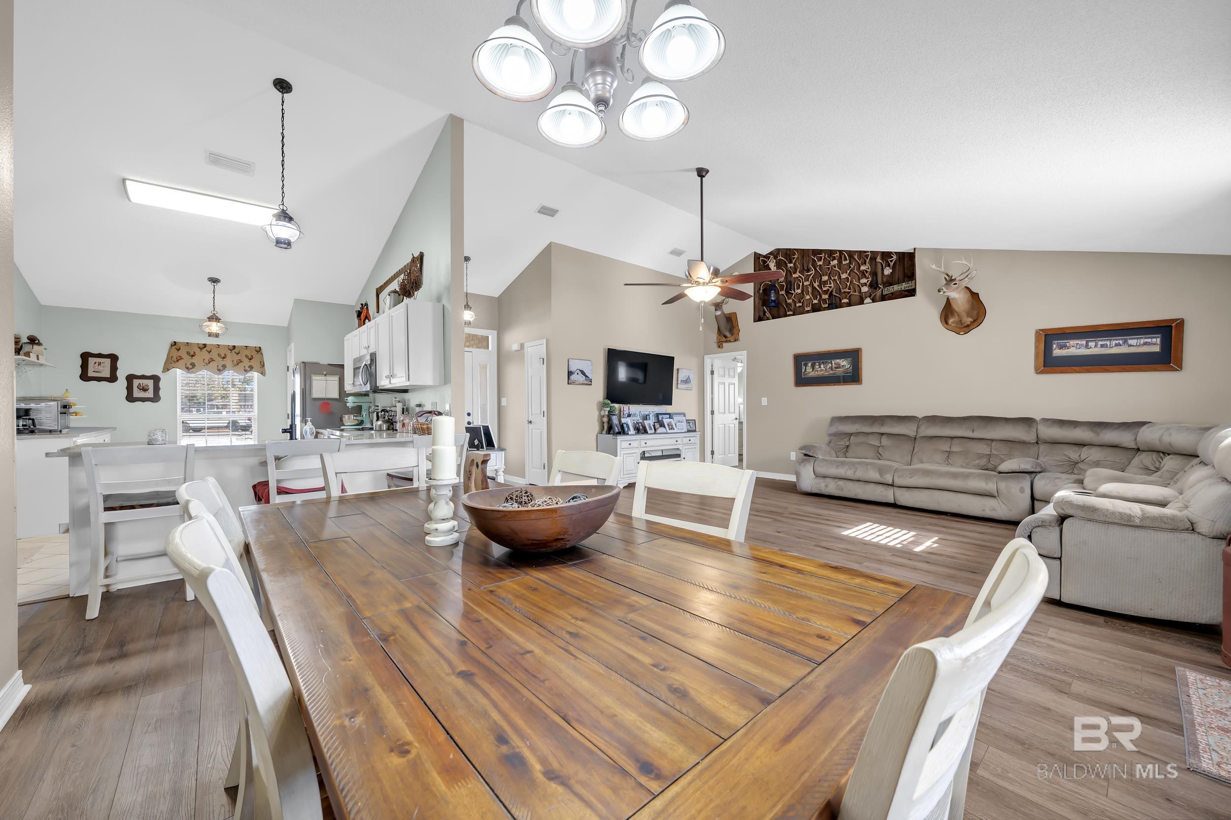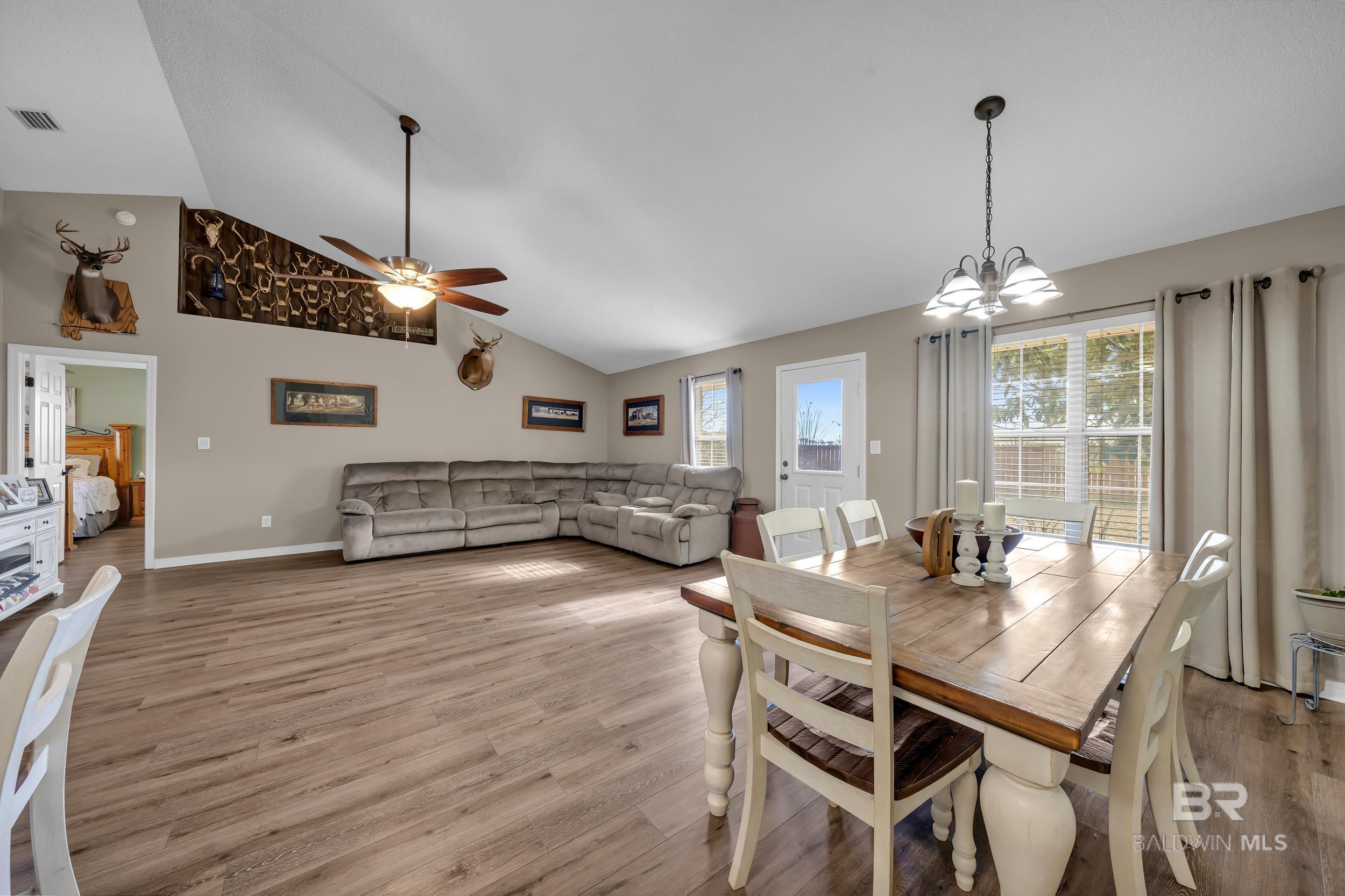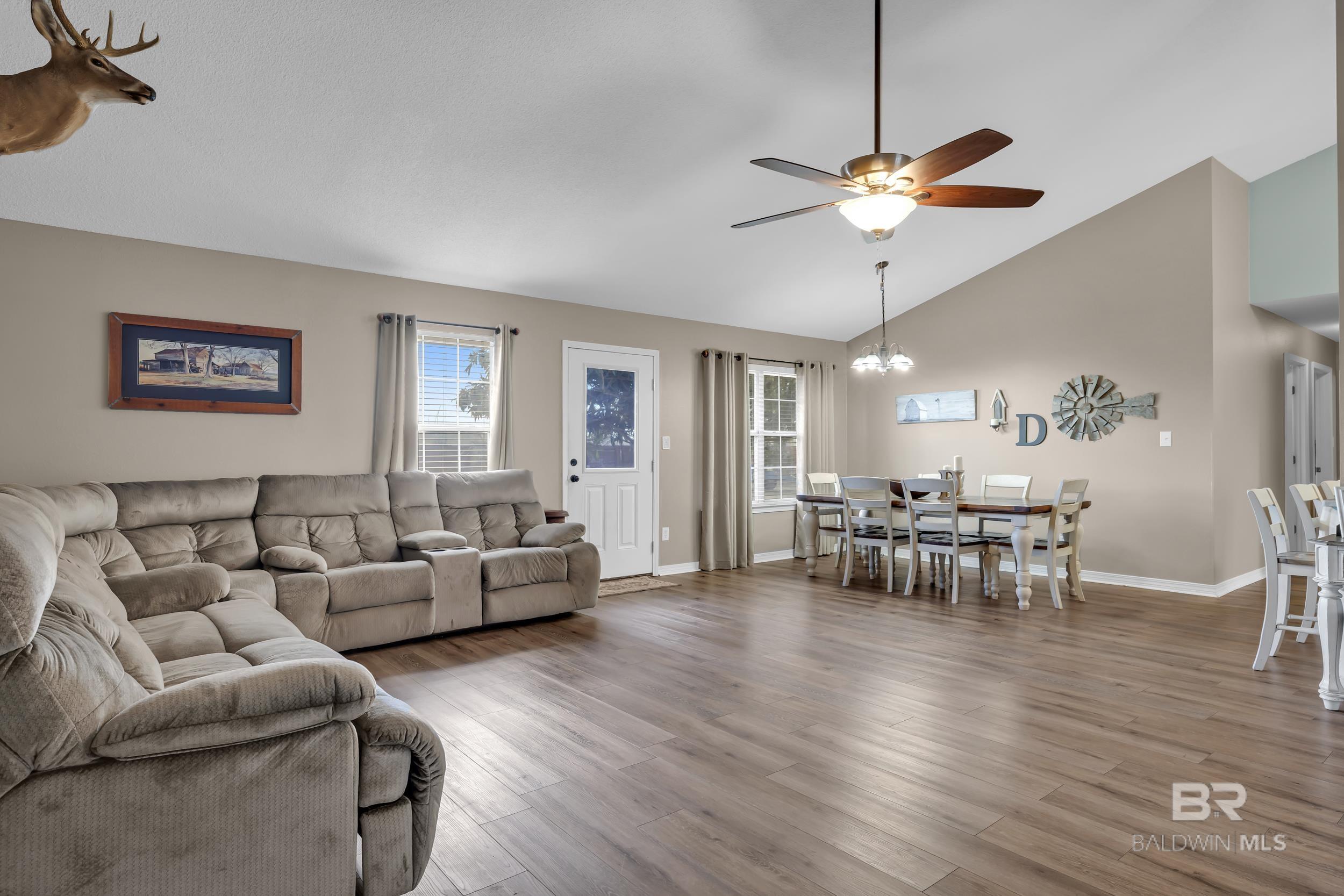 Curb Appeal in the Cul-De-Sac! Welcome to Camellia Woods, a charming neighborhood in the quaint community of Silverhill, Alabama. Winding streets lead to a well maintained brick home beneath the shade of a mighty oak tree in an inviting cul-de-sac. Home features 1,776 sf with 3 bedrooms and 2 baths, an open concept living room with a vaulted ceiling and split bedroom plan offering privacy for the primary suite. The well appointed kitchen includes a peninsula that grants generous countertop space. Updated flooring, primary bathroom vanities and tub/shower combination highlight the spacious primary suite that boasts large double closets. The back yard is one of the few that feature shade from mature trees and also fruit trees including loquat, fig and pear trees. The length and overall shape of the backyard ensure privacy and space, while there is also a double gate to enter the back yard from the front. A double garage and Graceland shed in the back yard offer plenty of room for parking and storage. Schedule your visit today to tour this well maintained home with a FORTIFIED ROOF! Buyer to verify all information during due diligence.