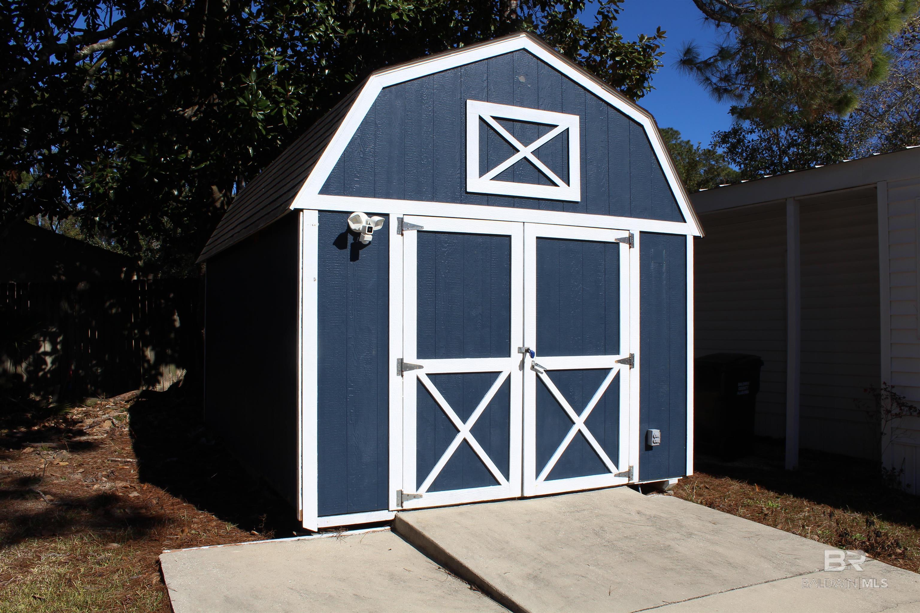 Clean, move in ready home with a functional but flexible floor plan. The original structure has an add on of a nice large den with built ins and an office. It is heated and cooled with a mini unit. The main part has an updated kitchen primary bedroom and bath, and a second bedroom and bath and a large living room. Heat Pump services the main part. Kitchen appliances are stainless stove, microwave and refrigerator and there is included a washer and dryer. Flooring is vinyl plank throughout. There is a screened in porch. Covered parking overhang.On the side is a large storage buiding/workshop and paved area large enough for a sizable RV. Subdivision amenities include: a long fishing pier on Perdido Bay, beach access, picnic area, clubhouse with party room and a large community pool which is also covered in winter for year round use, exercise areas. Property is close to Lillian boat launch and nearby shopping across the bridge. Buyer to verify all information during due diligence.