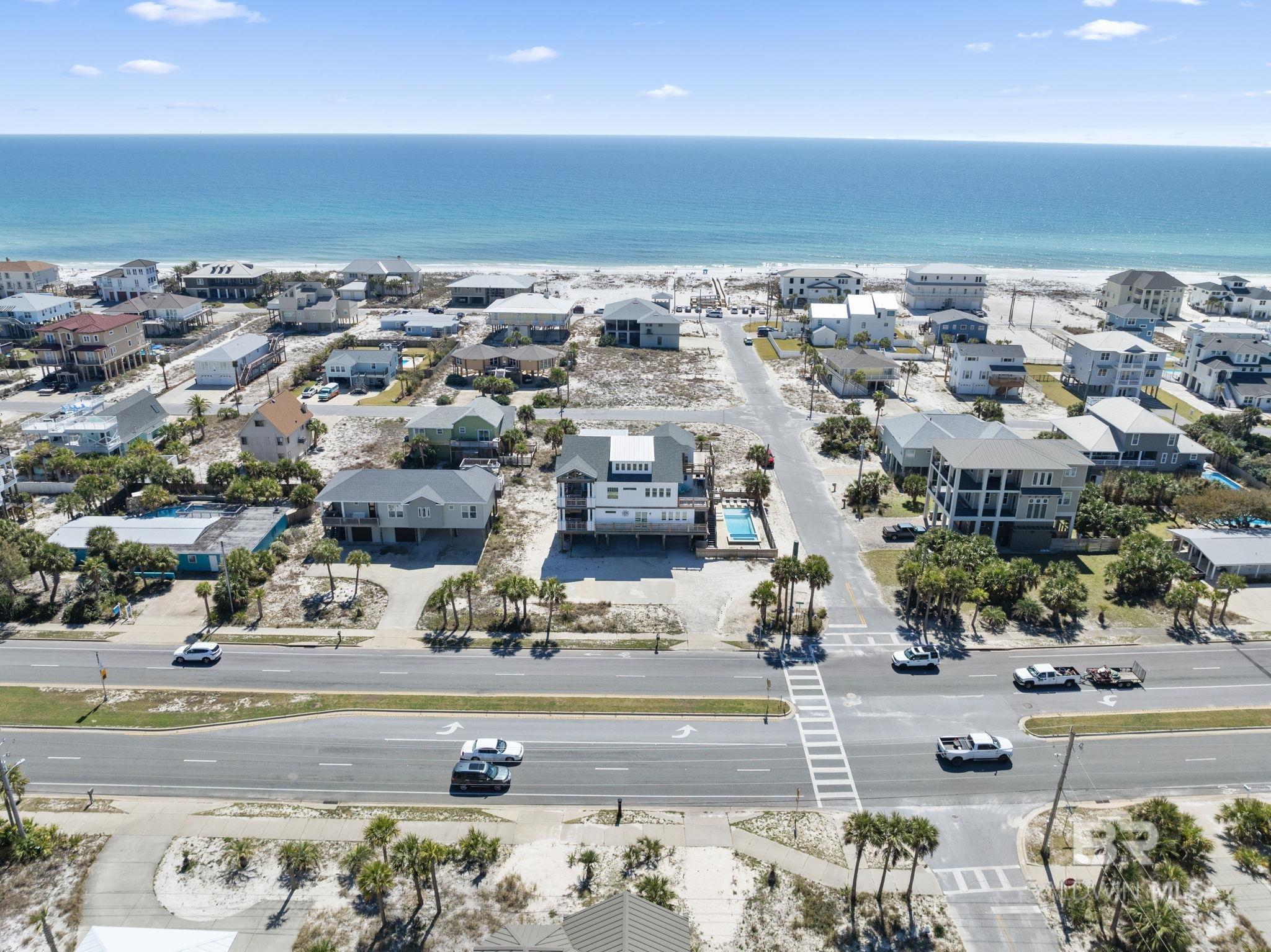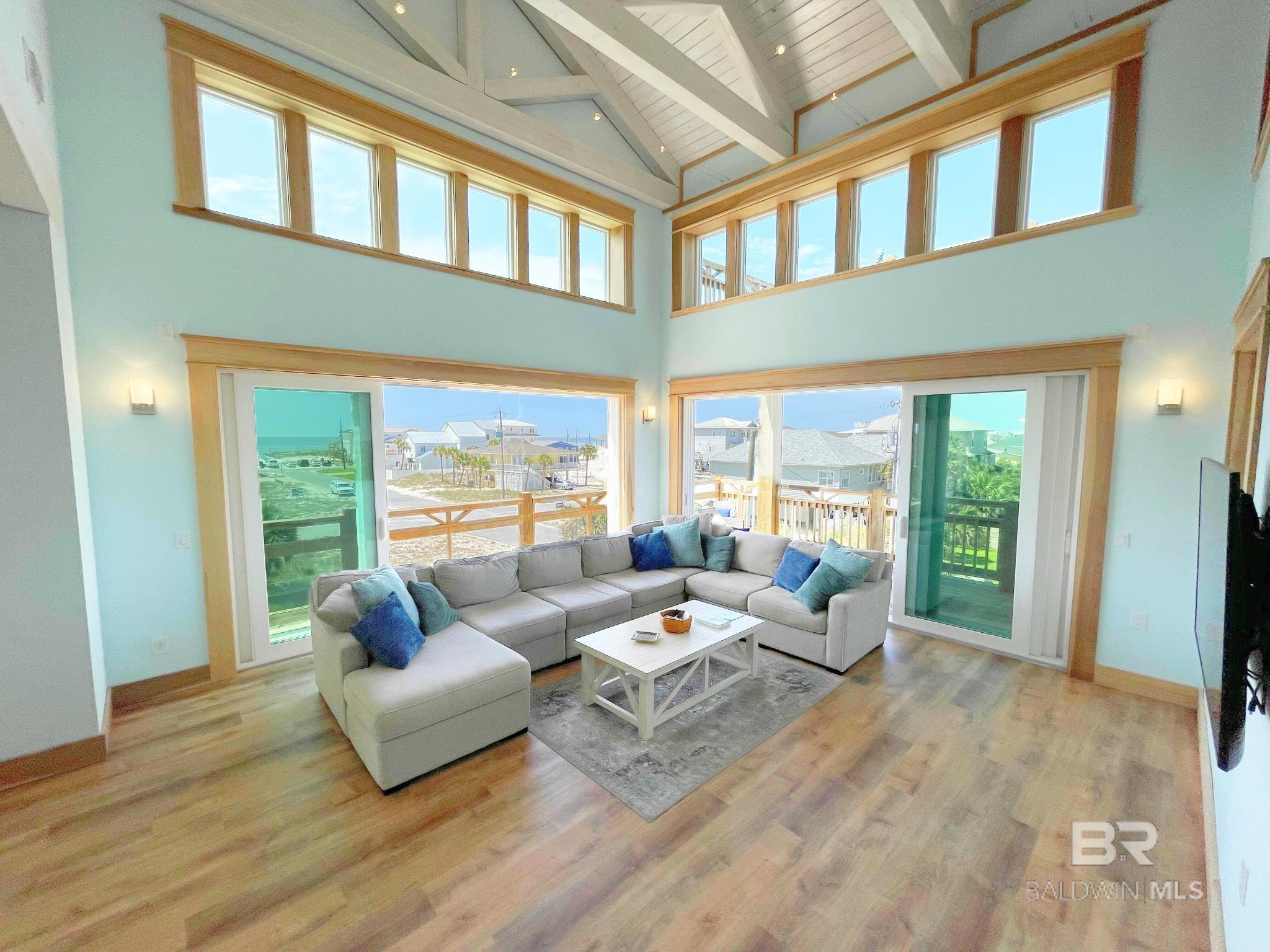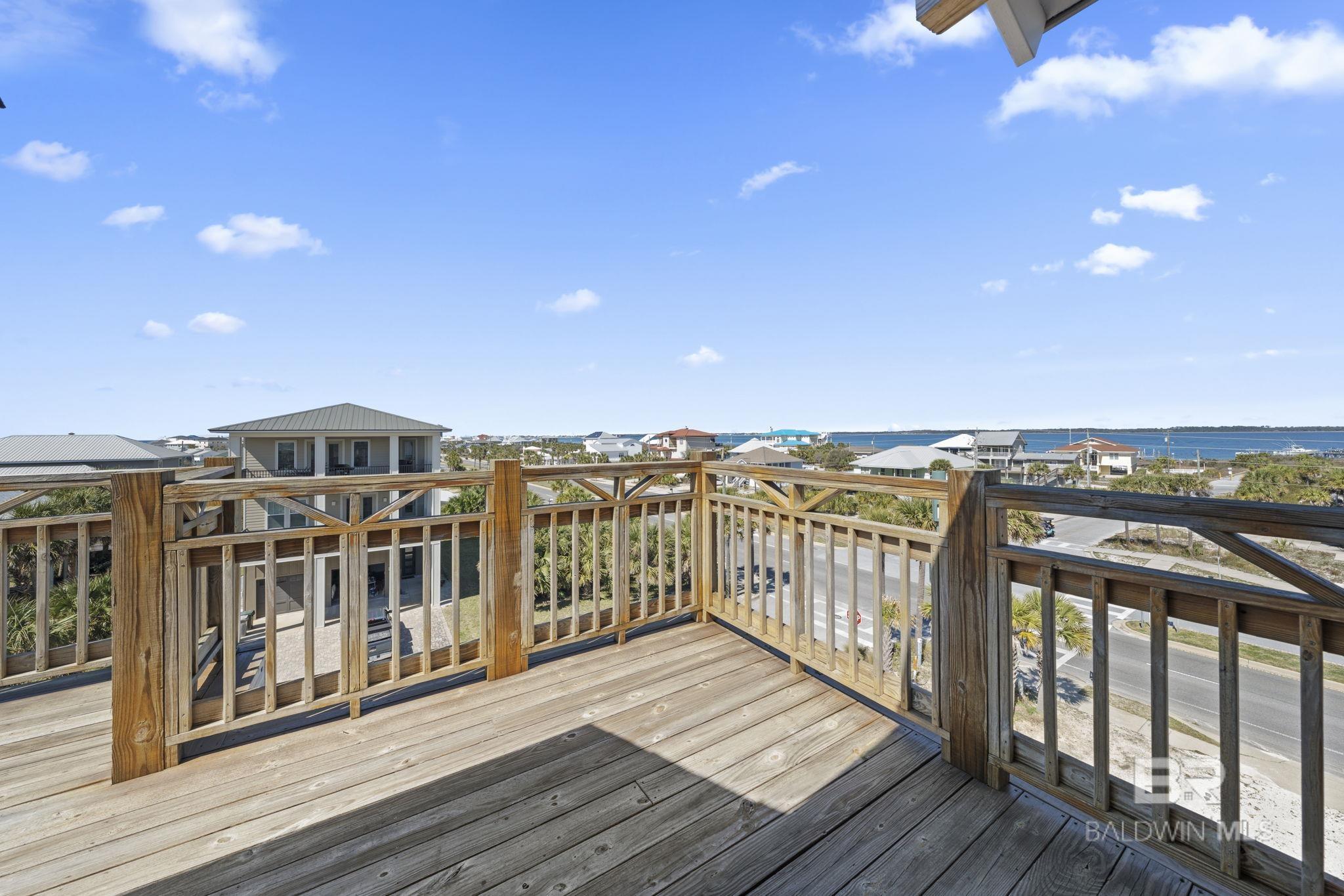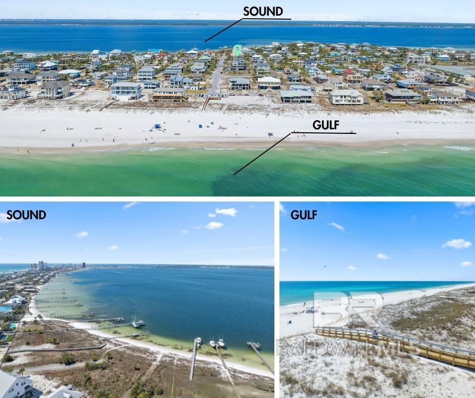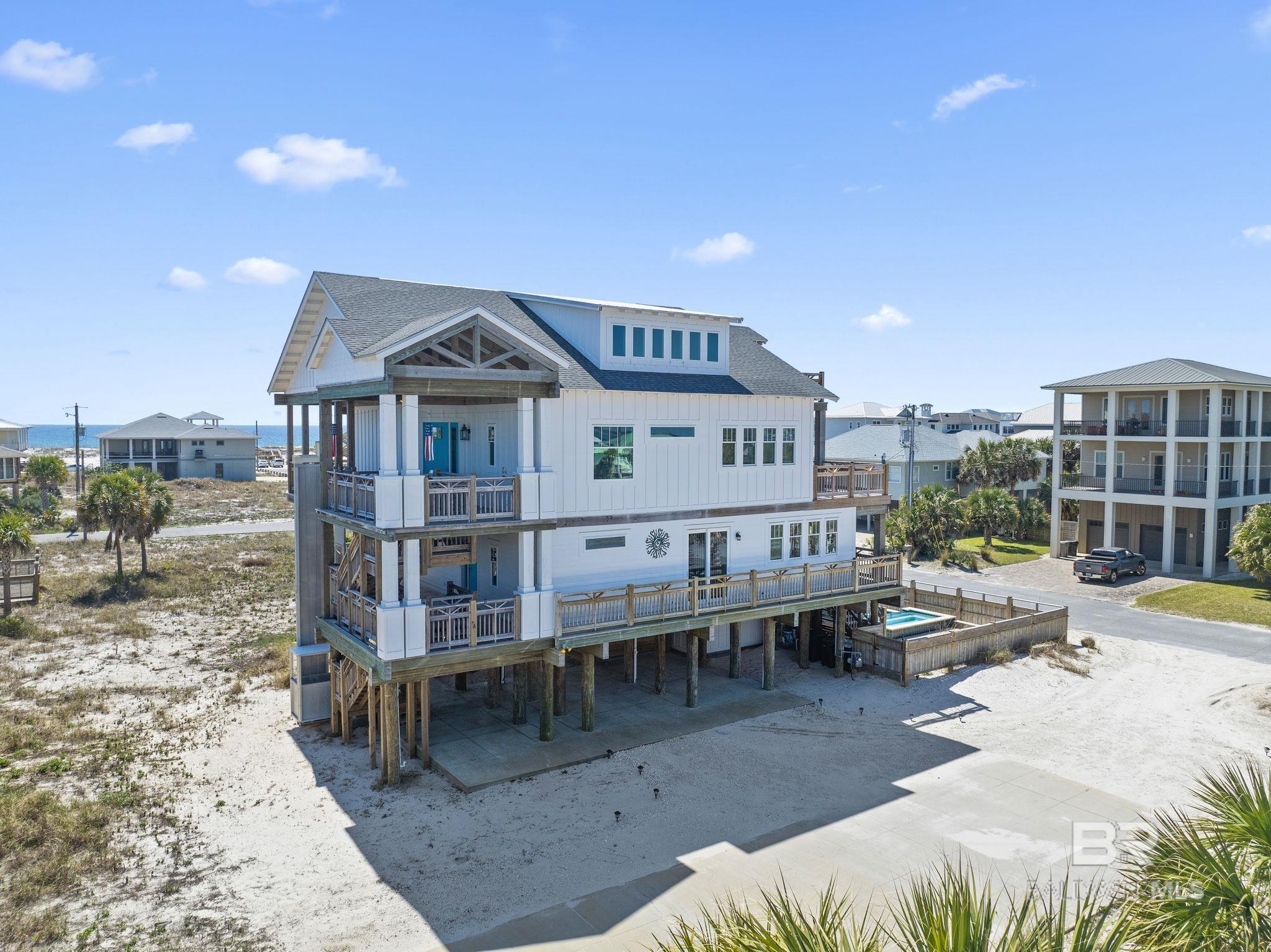 Welcome to the ultimate FURNISHED beach home, meticulously crafted 5-bedroom, 4.5-bathroom Craftsman-style residence with a heated pool, hot tub, & an additional expansive bonus room. Offering unparalleled comfort & tranquility, every corner of this residence affords breathtaking views of the glistening turquoise waters of the Gulf & calming waters of the Sound. Travel upstairs or take the elevator, & step into your dream home. The living space seamlessly flows together, while also allowing privacy within the layout, with separate entry doors at the main & second level. On the main level, immediately be drawn to the impressive 25' trussed ceiling that create a sense of grandeur space, which is adorned with custom high-end Tulip poplar trim, white oak stairs, crafted to perfection & the expansive 8' accordion sliding glass doors, brightening the space with rays of sunshine & offering breathtaking views of the coastal scenery. An expansive kitchen features stainless steel appliances, complete with a wine cooler & ice maker. The primary suite, like all bedrooms in the residence, has direct balcony access. The ensuite offers its own spa-like experience, with a soaking tub, water view, rain shower, marble vanities, expansive closet, washer & dryer. Downstairs can serve as an additional living quarter for your family or guests, with a large great room, washer, dryer, & kitchenette to include sink & fridge. 3 more bedrooms, each with balcony access & water views, are on the downstairs level. Adding to the allure of this custom home are the endless possibilities of the space of the top floor bonus room, which can easily be converted to game room, bunk suite or two more bedrooms & a newly added FULL BATH with walk-in tiled shower. Outside living area is exceptional for entertaining, with its large, covered patio, heated gunite pool, hot tub, NEW POOL FURNITURE, outdoor shower, water closet, large storage area & fenced yard. Beach home or investment-LIMITLESS possibilities!