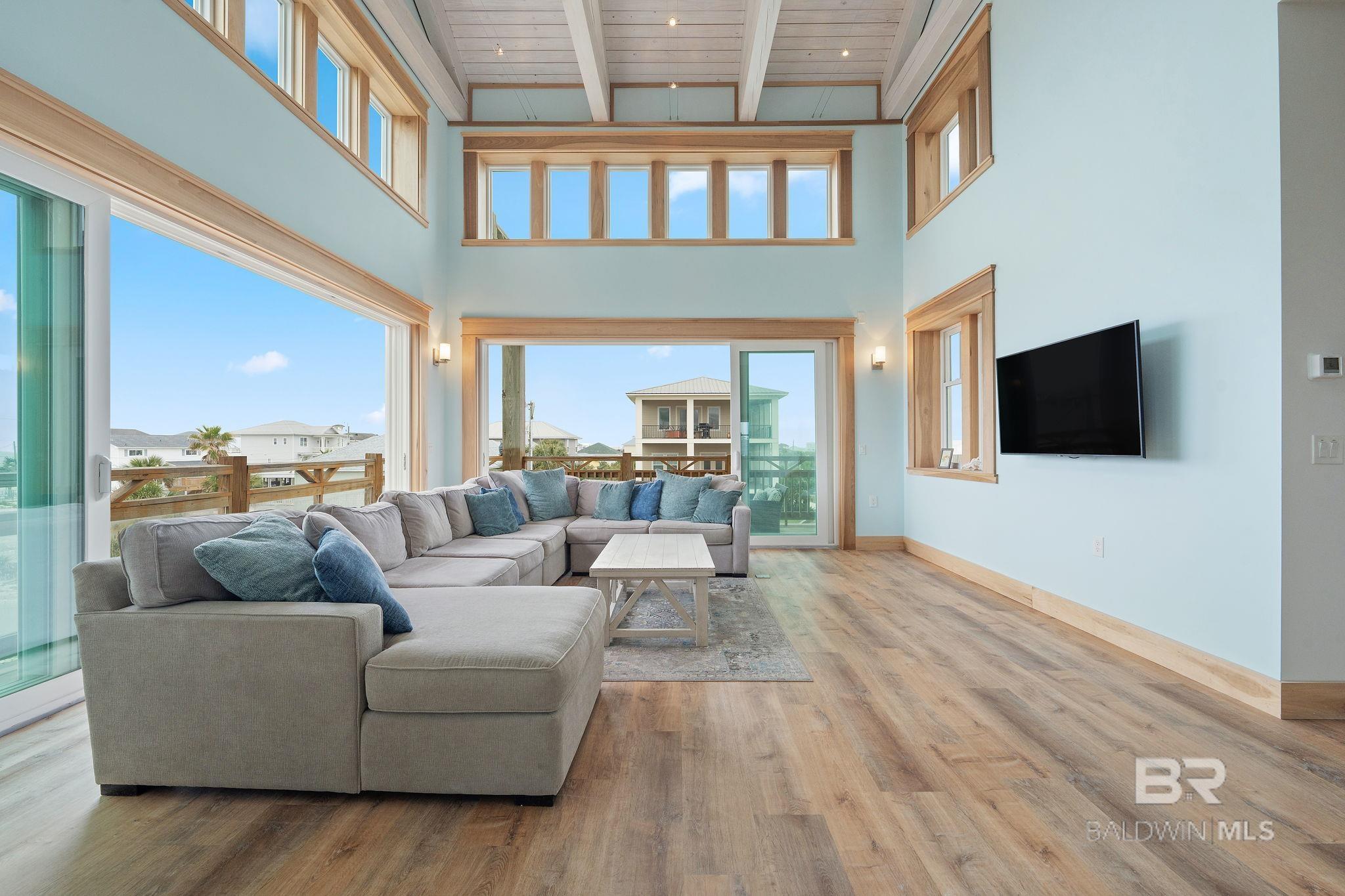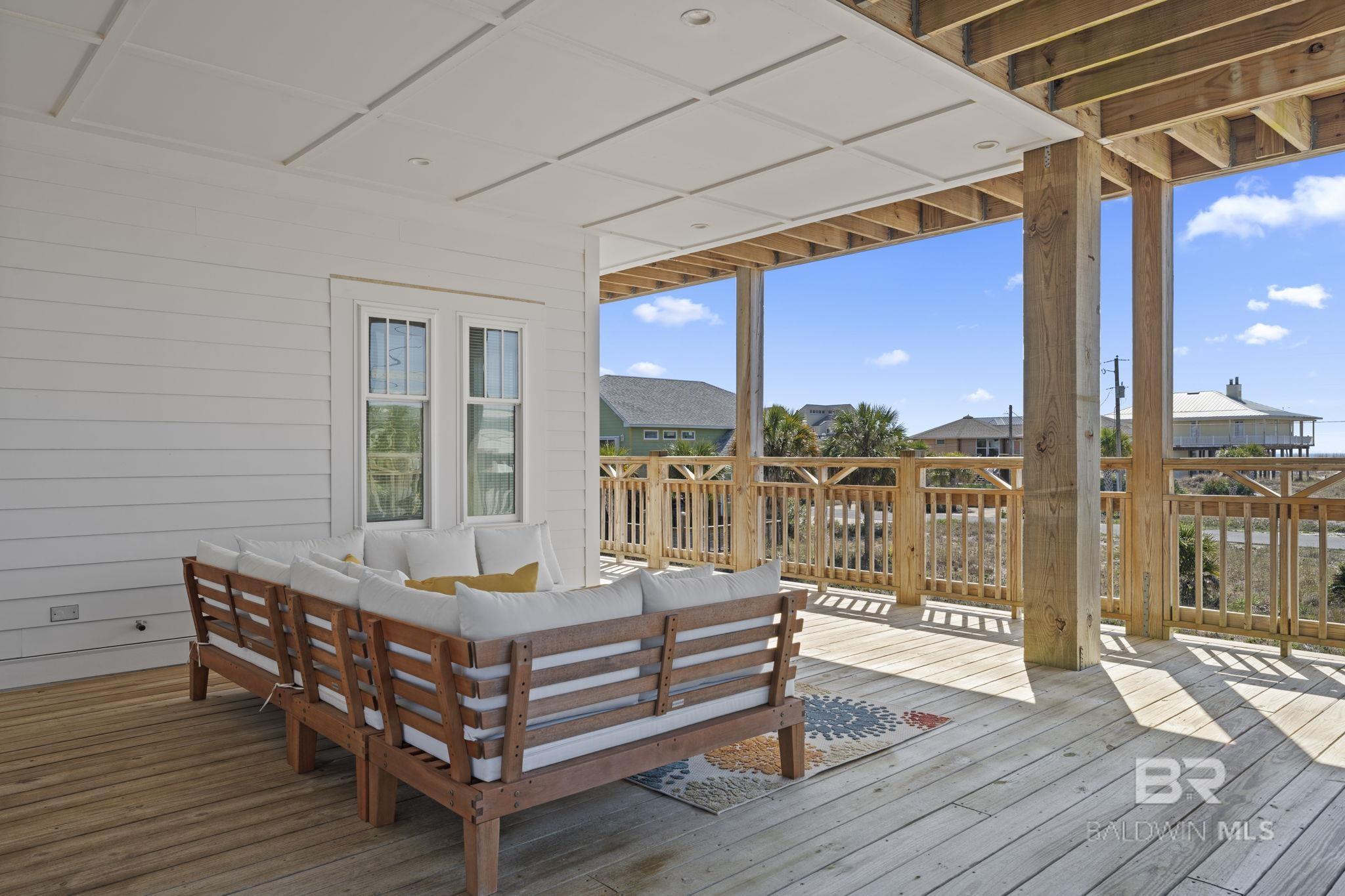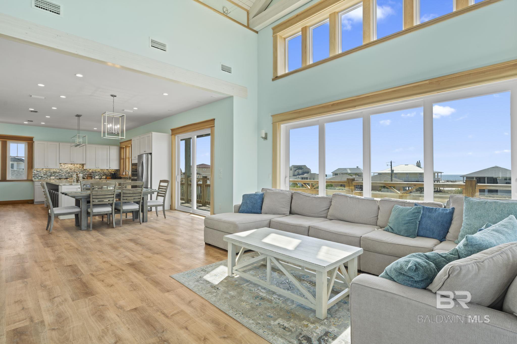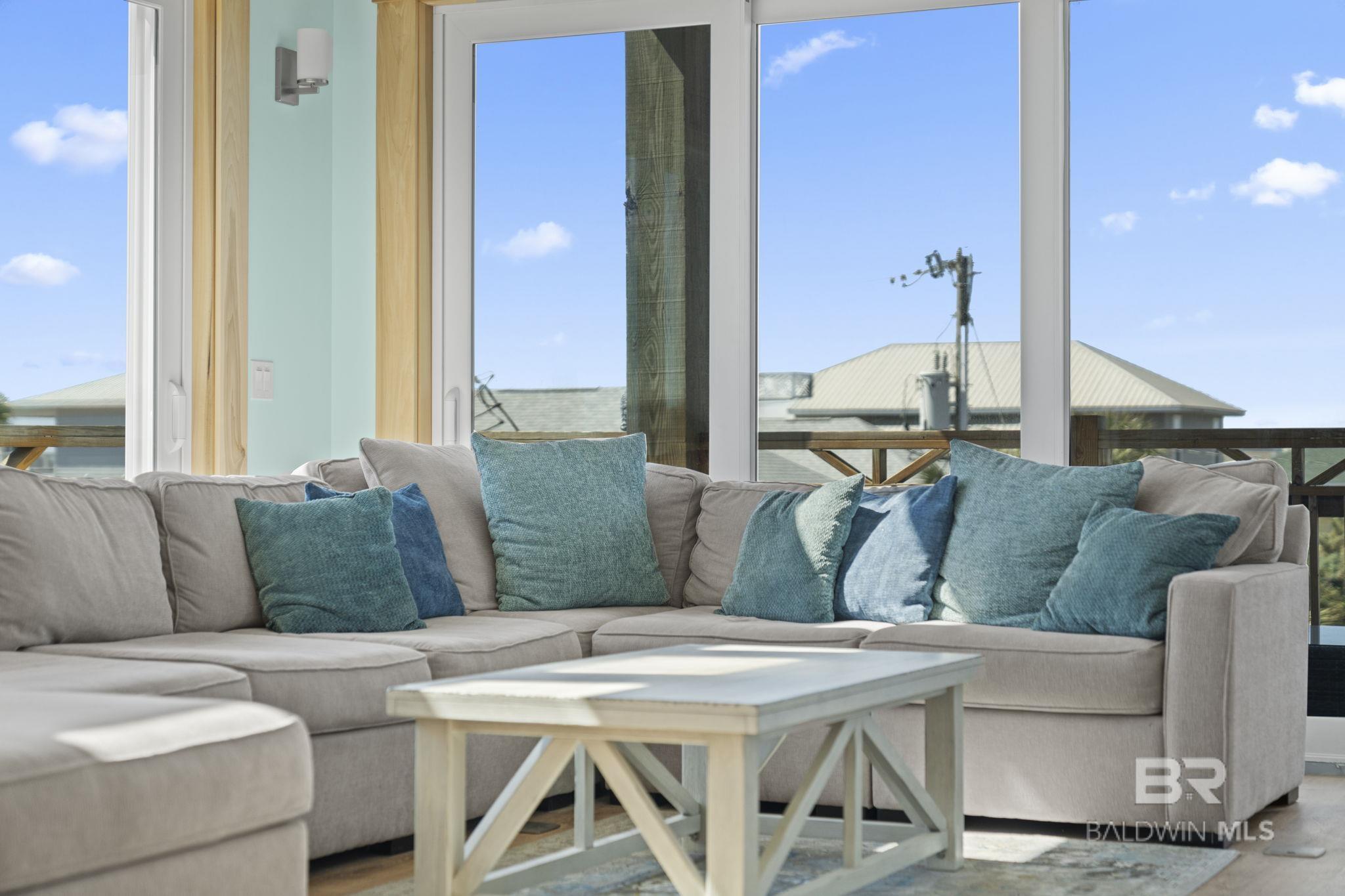 Welcome to the ultimate FURNISHED beach home, meticulously crafted 5-bedroom, 4.5-bathroom Craftsman-style residence with a heated pool, hot tub, & an additional expansive bonus room. Offering unparalleled comfort & tranquility, every corner of this residence affords breathtaking views of the glistening turquoise waters of the Gulf & calming waters of the Sound. Travel upstairs or take the elevator, & step into your dream home. The living space seamlessly flows together, while also allowing privacy within the layout, with separate entry doors at the main & second level. On the main level, immediately be drawn to the impressive 25' trussed ceiling that create a sense of grandeur space, which is adorned with custom high-end Tulip poplar trim, white oak stairs, crafted to perfection & the expansive 8' accordion sliding glass doors, brightening the space with rays of sunshine & offering breathtaking views of the coastal scenery. An expansive kitchen features stainless steel appliances, complete with a wine cooler & ice maker. The primary suite, like all bedrooms in the residence, has direct balcony access. The ensuite offers its own spa-like experience, with a soaking tub, water view, rain shower, marble vanities, expansive closet, washer & dryer. Downstairs can serve as an additional living quarter for your family or guests, with a large great room, washer, dryer, & kitchenette to include sink & fridge. 3 more bedrooms, each with balcony access & water views, are on the downstairs level. Adding to the allure of this custom home are the endless possibilities of the space of the top floor bonus room, which can easily be converted to game room, bunk suite or two more bedrooms & a newly added FULL BATH with walk-in tiled shower. Outside living area is exceptional for entertaining, with its large, covered patio, heated gunite pool, hot tub, NEW POOL FURNITURE, outdoor shower, water closet, large storage area & fenced yard. Beach home or investment-LIMITLESS possibilities!